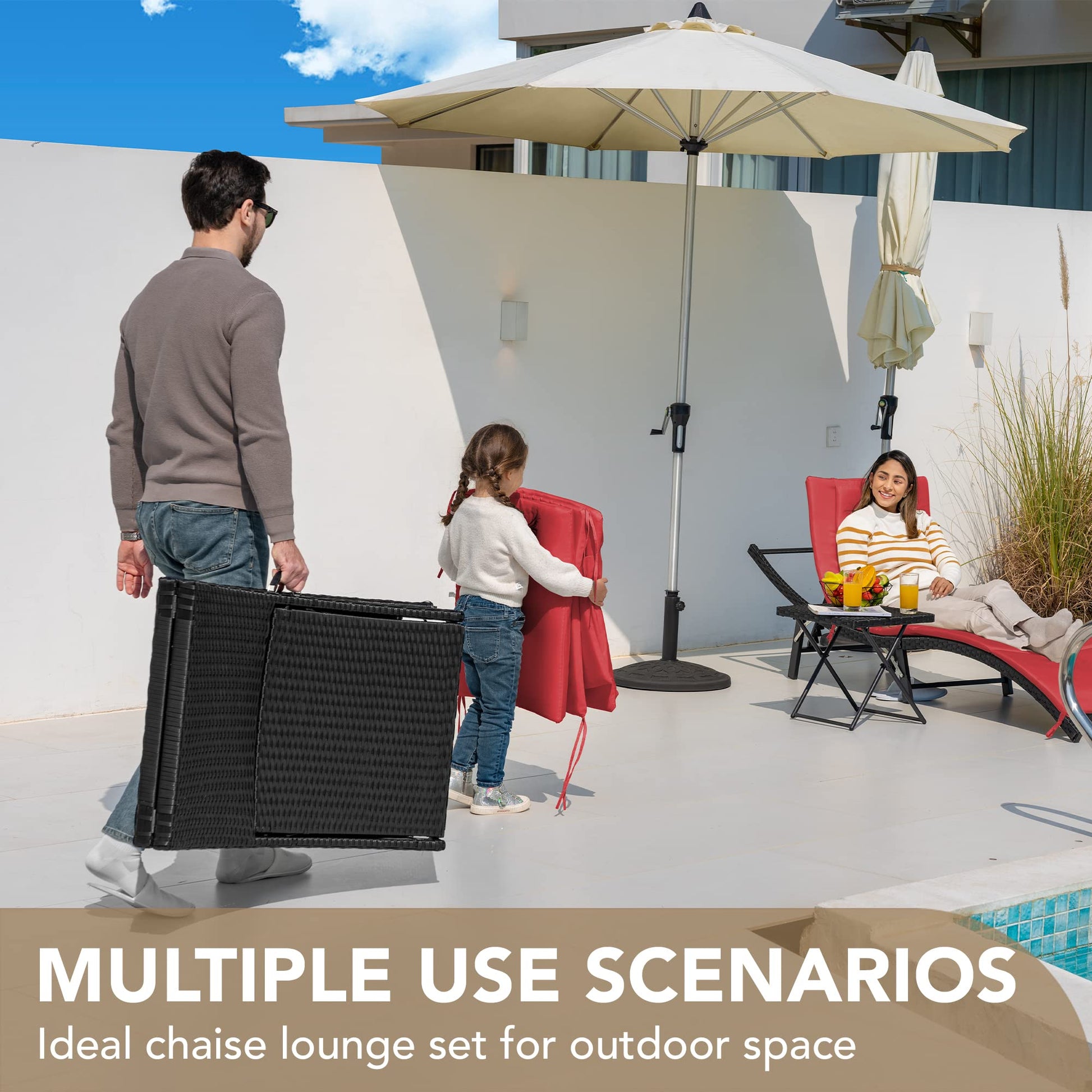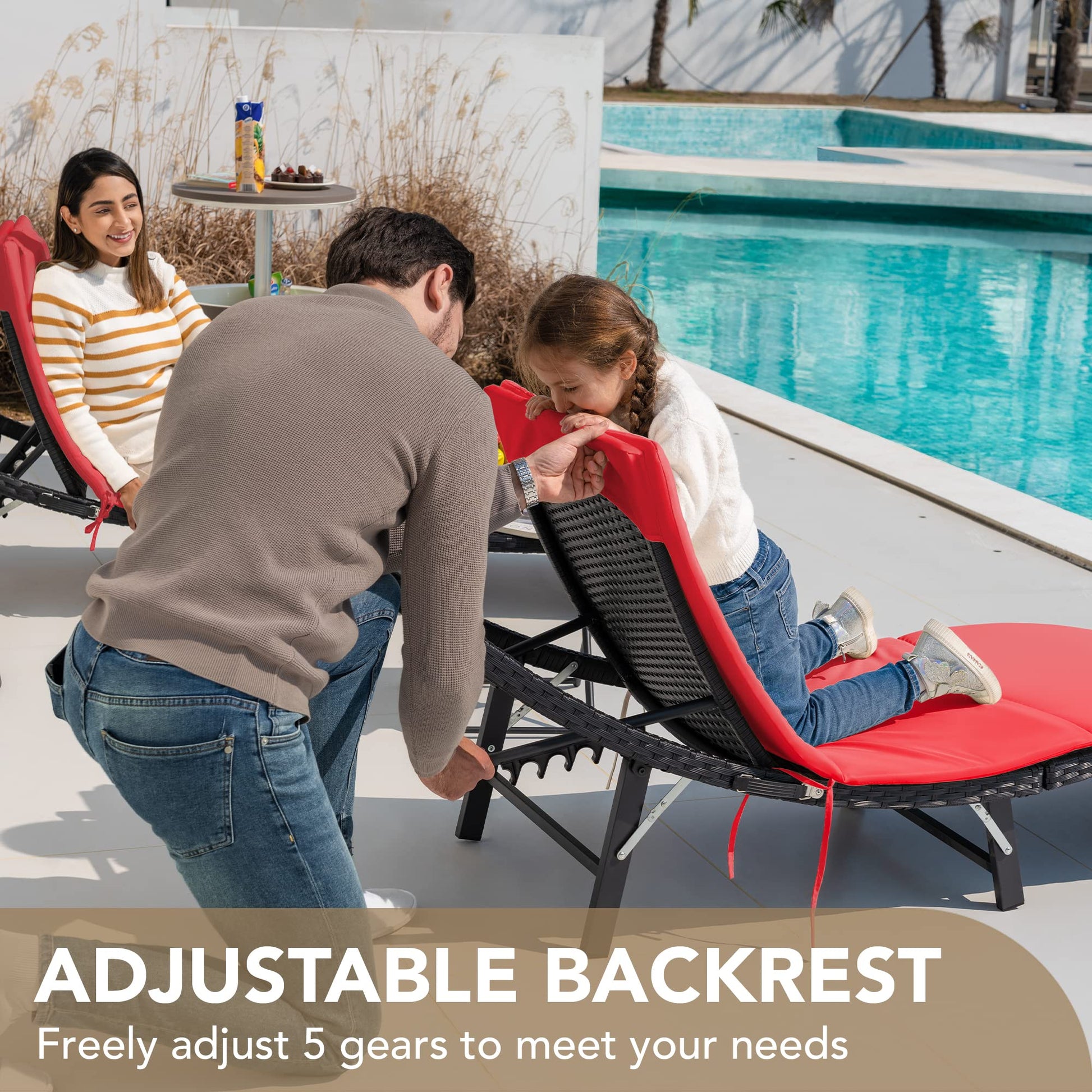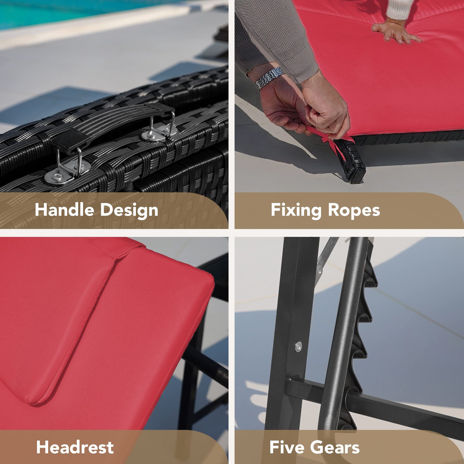 Furniture 3 Pieces Cushioned Rattan Chaise Lounge Sets (Red, Outdoor, Adjustable Back
