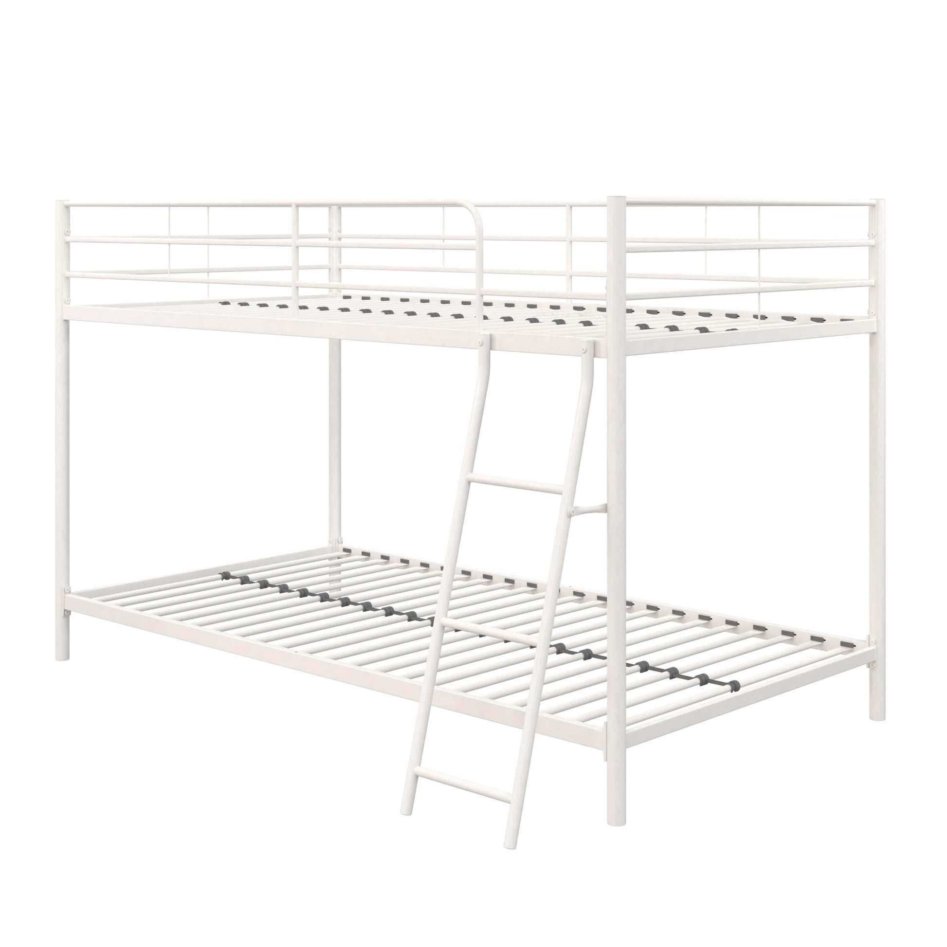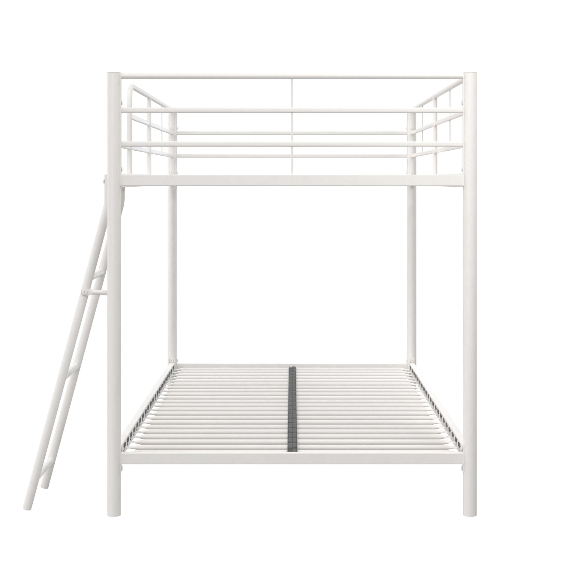 - Secured metal slats provide support. The ladder attaches to the top bed, which also includes full-length guardrails for added safety