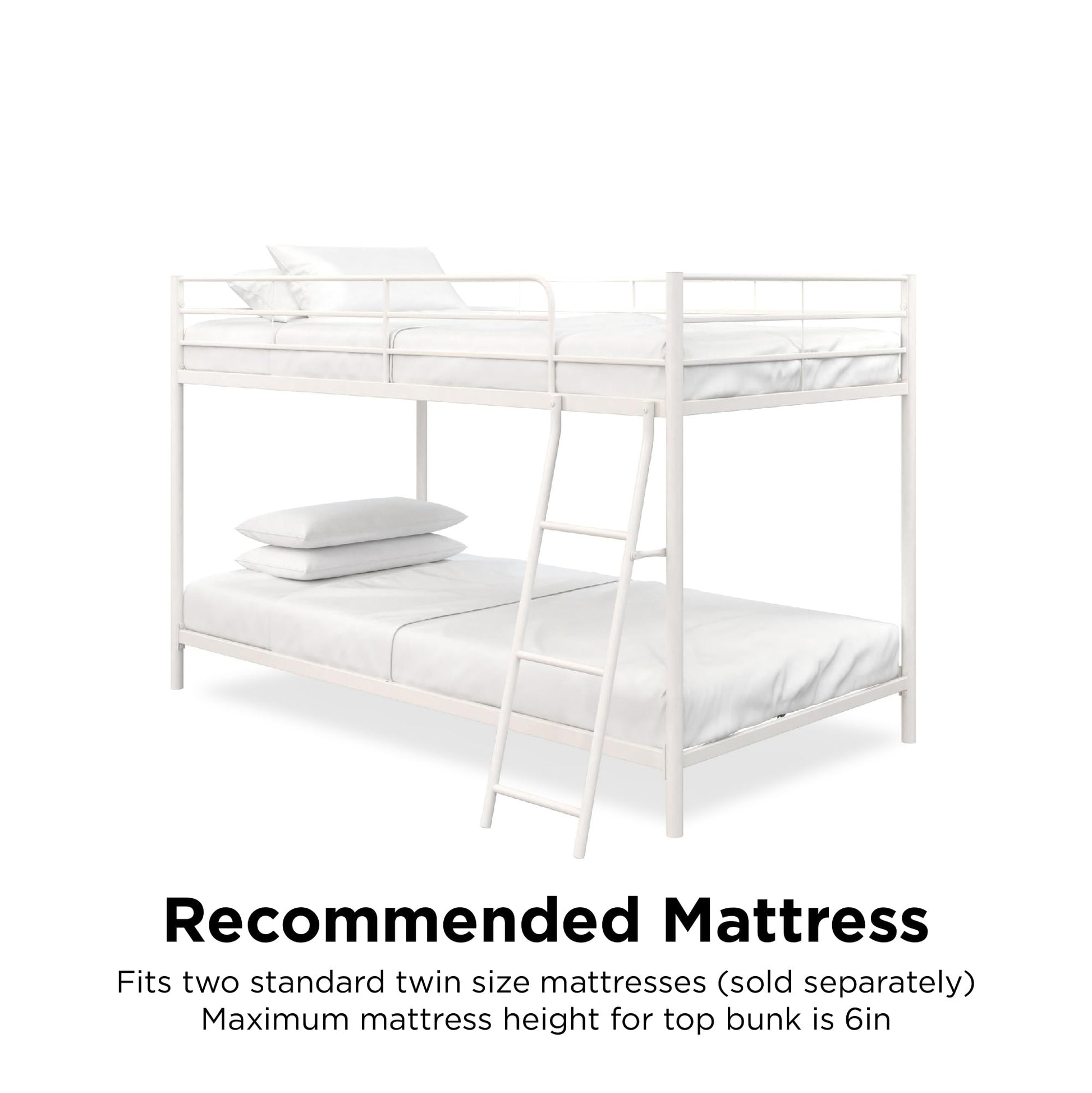 - Fits two standard twin size mattresses (sold separately), max height for top bunk is 6"