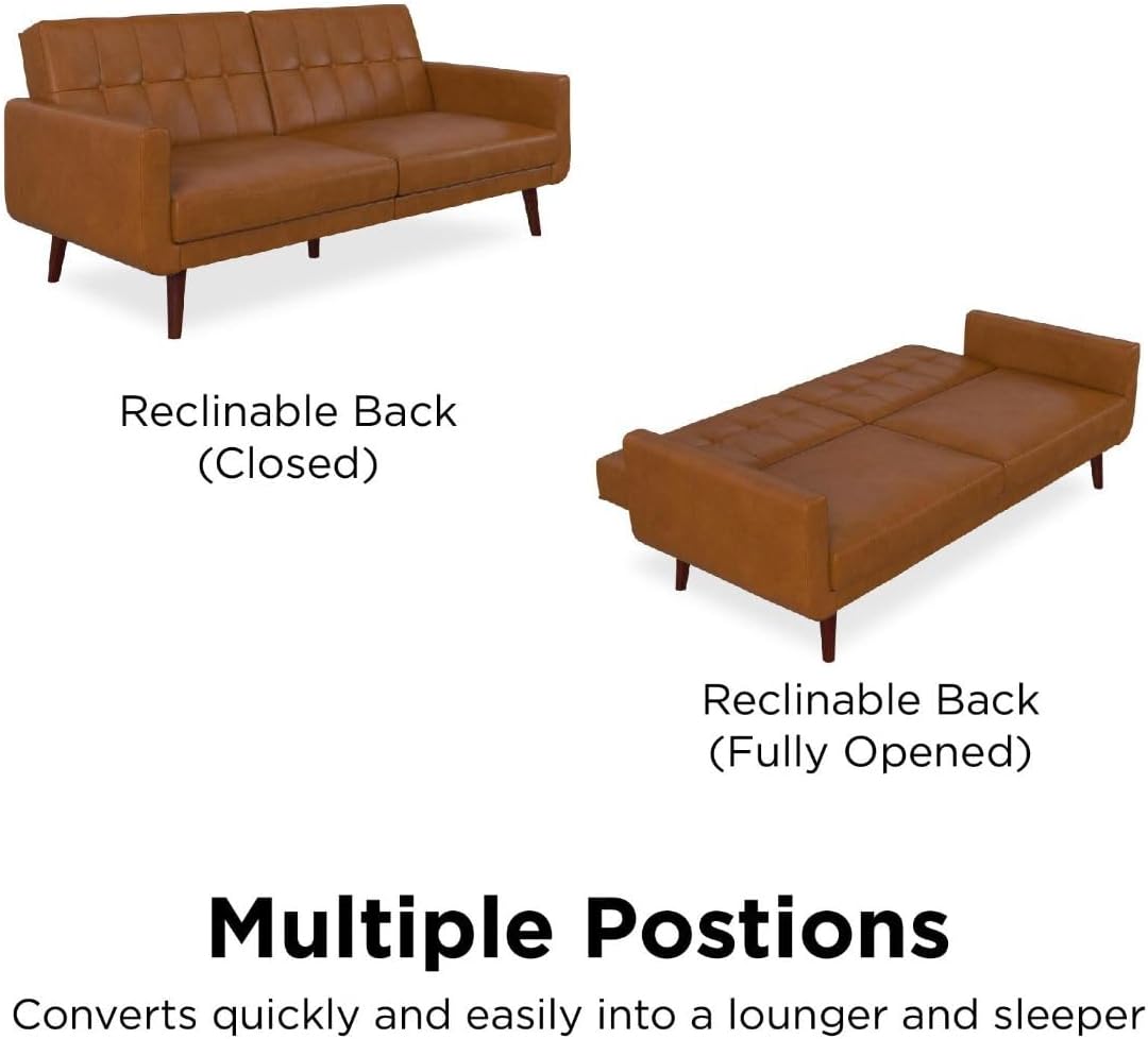 - Mid Century modern design with a tufted back, tapered wood legs and faux leather upholstery.