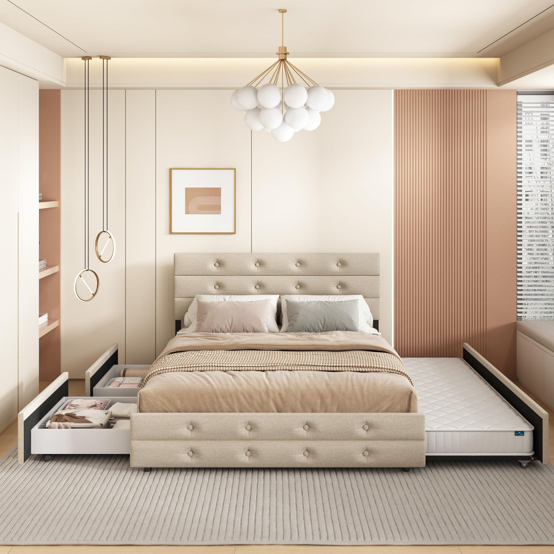Queen Size Upholstered Bed with Trundle Bed and Two Storage Drawers Beige Tufted