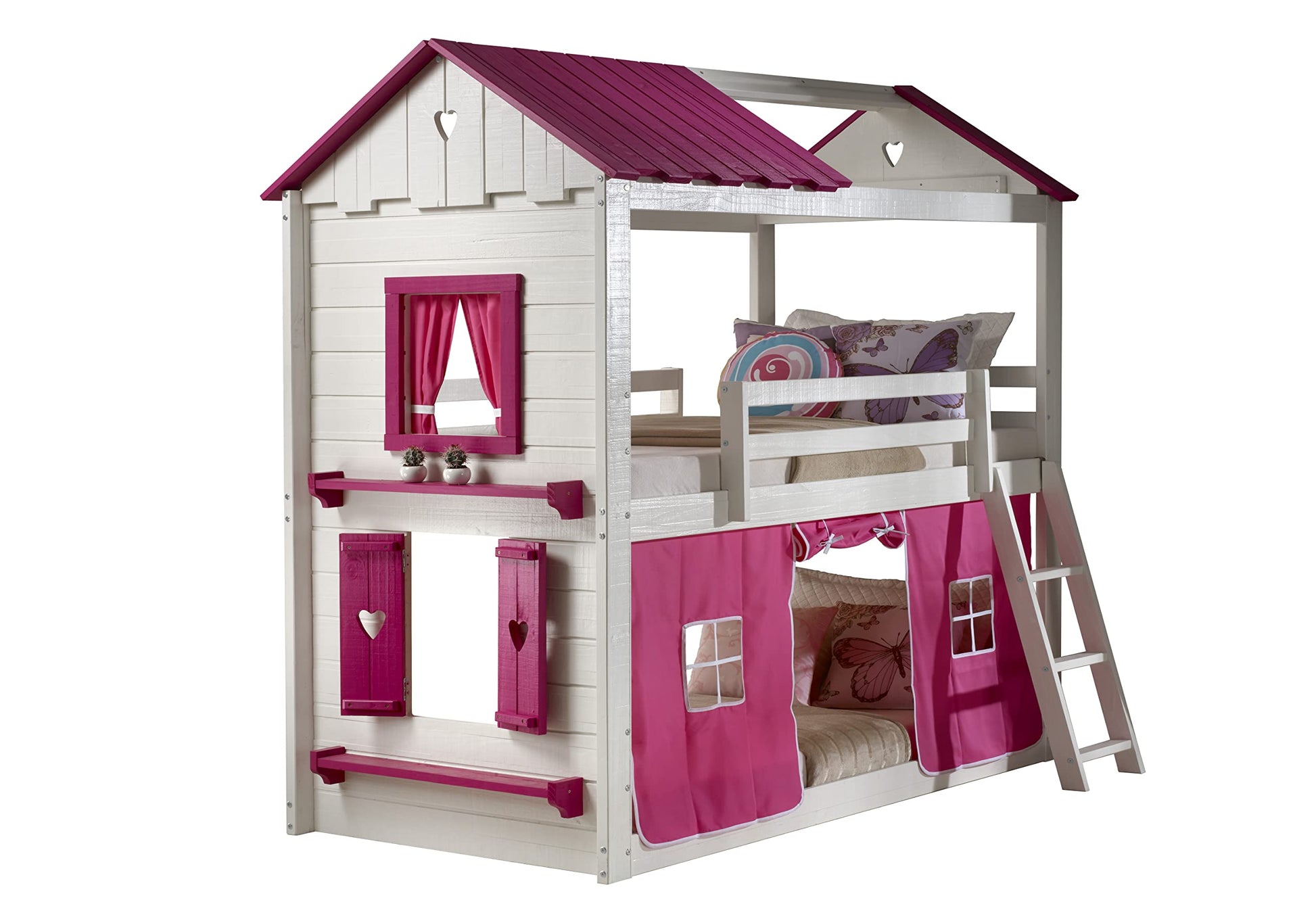 - This Bunkbed features a safe, easy to use ladder, a Beautiful design in White and Pink finish and Pink Tent