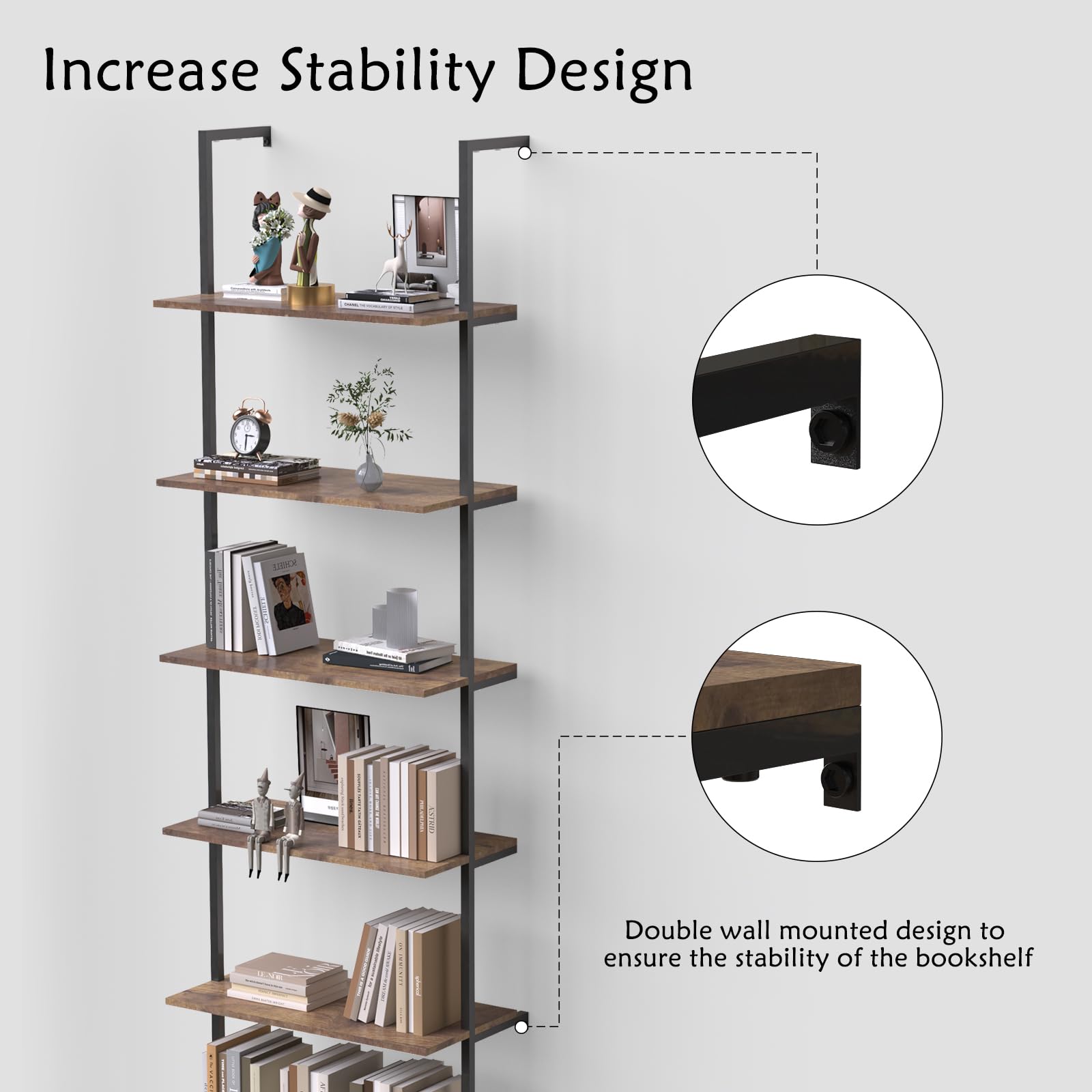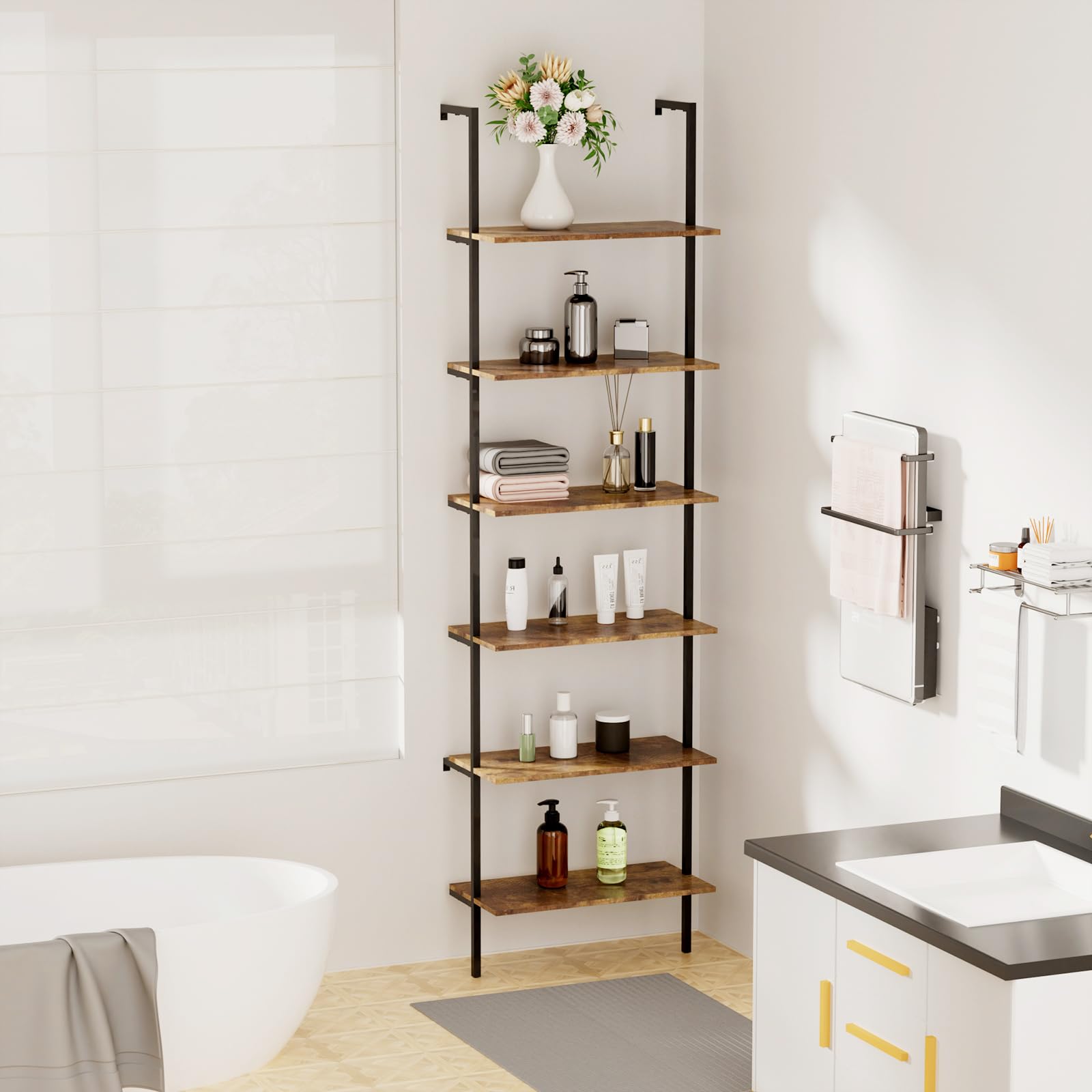 Bookshelf 6-Tier Industrial Ladder Shelf,Brown Shelves Wall Mounted Bookshelf Open Storage Rack Display Shelf Plant Stand for Living Room Kitchen Home Office Bedroom
