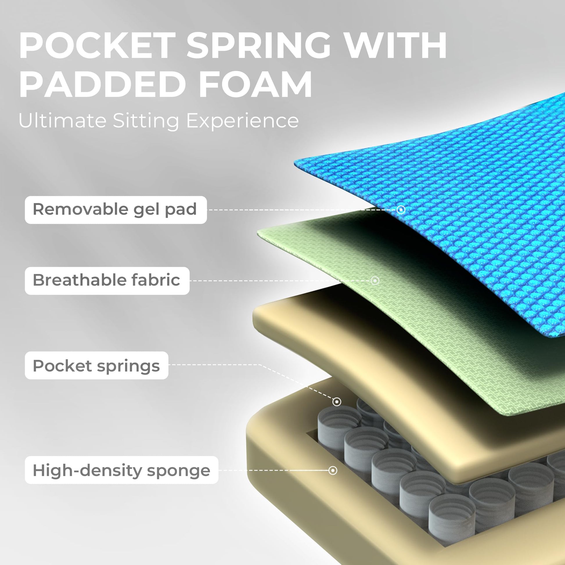 - Individual Pocket Springs The seat cushion is composed of pocket springs, a type of spring commonly used in sofas. Each spring operates independently, offering elasticity and support by adapting to pressure and contouring to your body's weight, providing a luxurious and comfortable experience akin to that of a sofa.