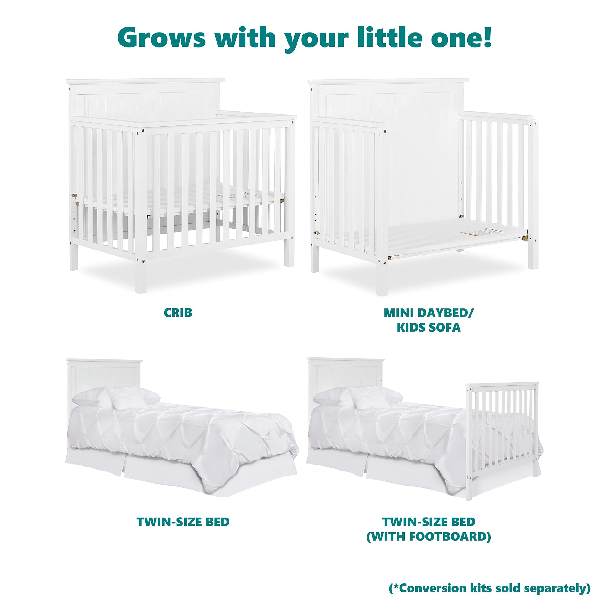 - CONVERTIBILITY OPTIONS: The Ava 4-in-1 Convertible Mini Crib grows with your child! Starting as a mini crib, you can convert it into a mini daybed and twin-size bed (bed rails sold separately) Built of solid pinewood, it makes for a durable investment