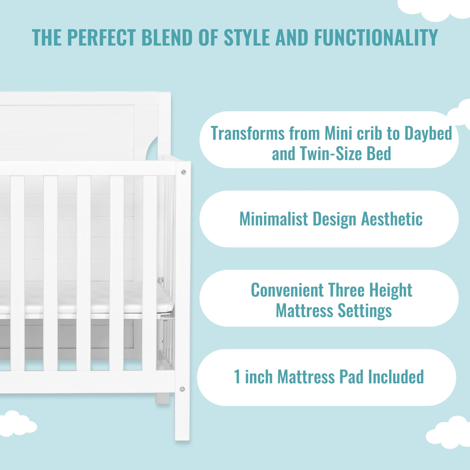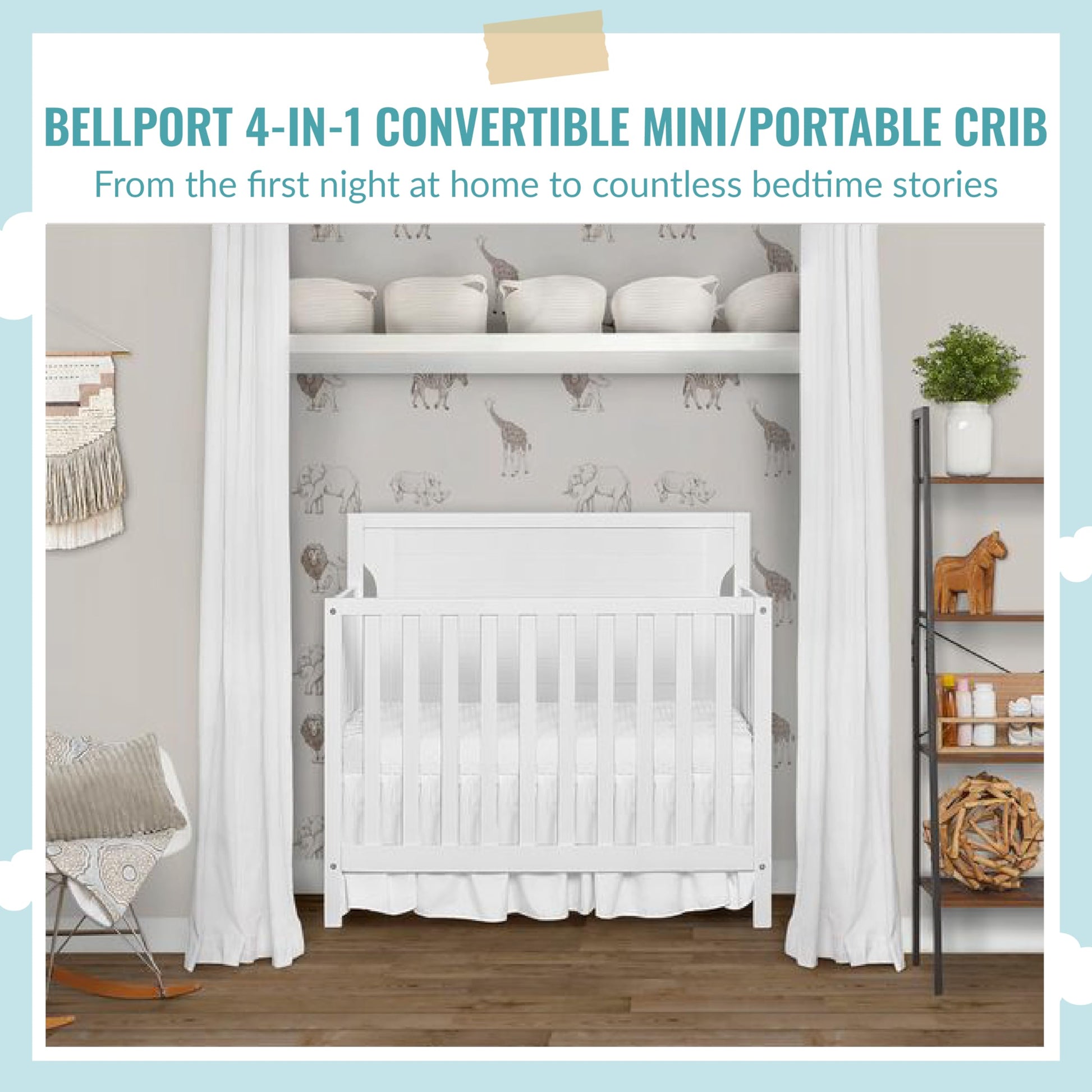 - CONVERTIBILITY OPTIONS: Keep pace with your growing child’s changing needs with the Bellport 4-in-1 Convertible Mini Crib. Starting as a mini crib, you can convert it into a mini daybed and twin-size bed (bed rails sold separately)