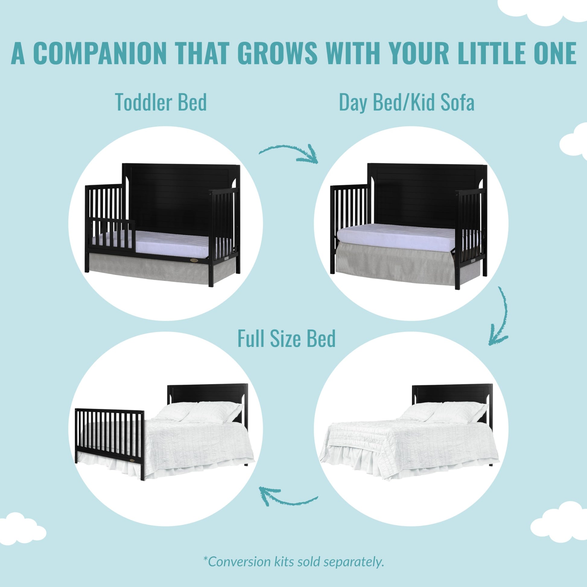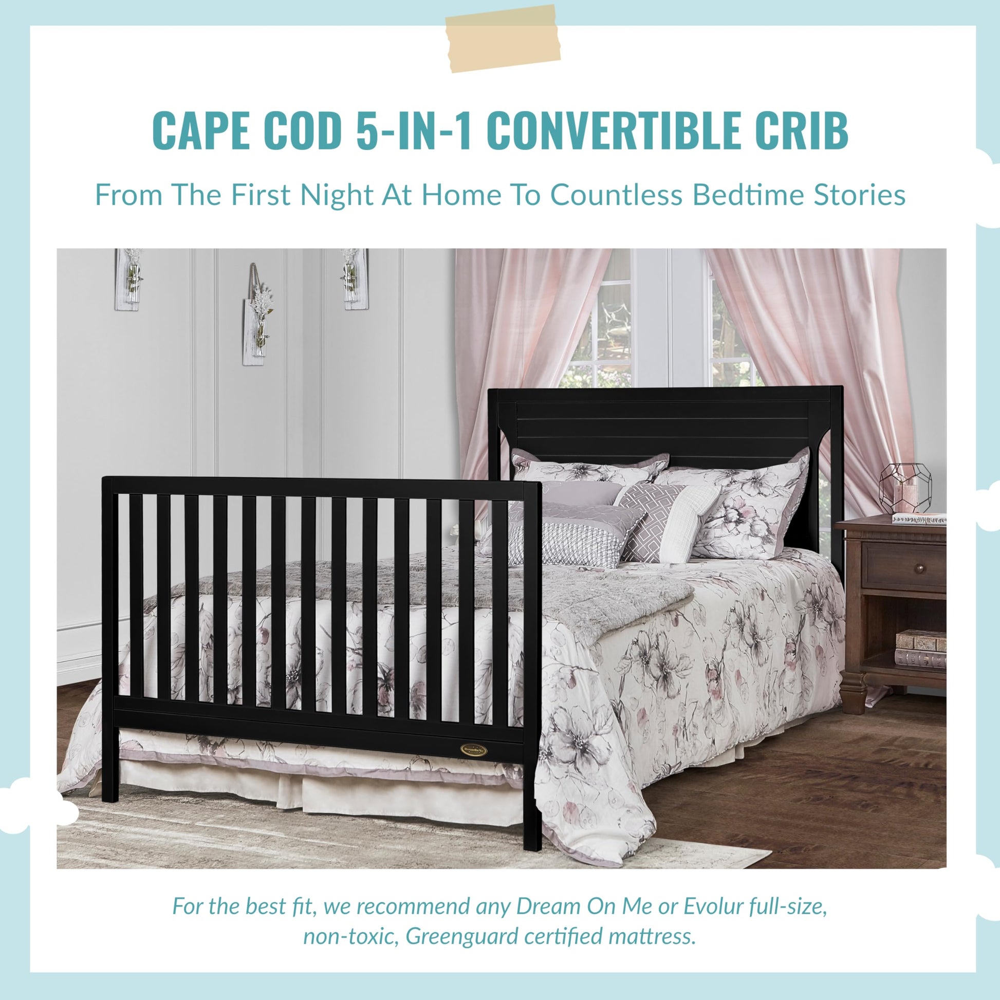 - 5-IN-1 CONVERTIBILITY: The Cape Cod converts effortlessly from a crib into a toddler and daybed (conversion kit sold separately), The back panel converts to a full-size headboard- add our bed frame (sold separately) to convert into a full-size bed