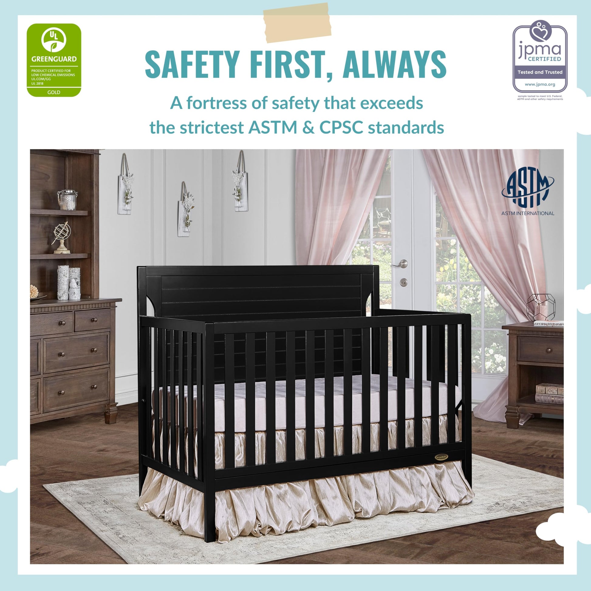 - SAFETY FIRST: All our cribs are JPMA Certified to meet/exceed CPSC/ASTM safety standards, Our products are tested by 3rd party labs for lead/other toxic elements to meet/exceed CPSC/ASTM safety standards