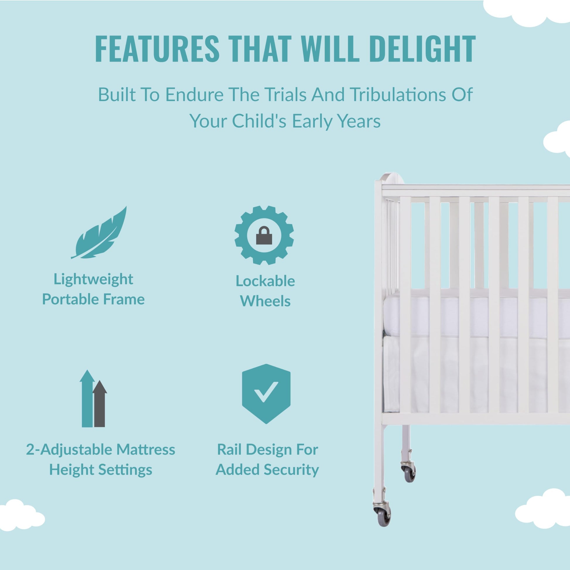Folding Full Size Convenience Crib In White, Two Adjustable Mattress Height Positions,