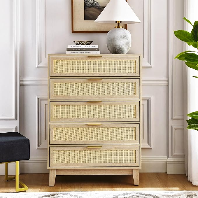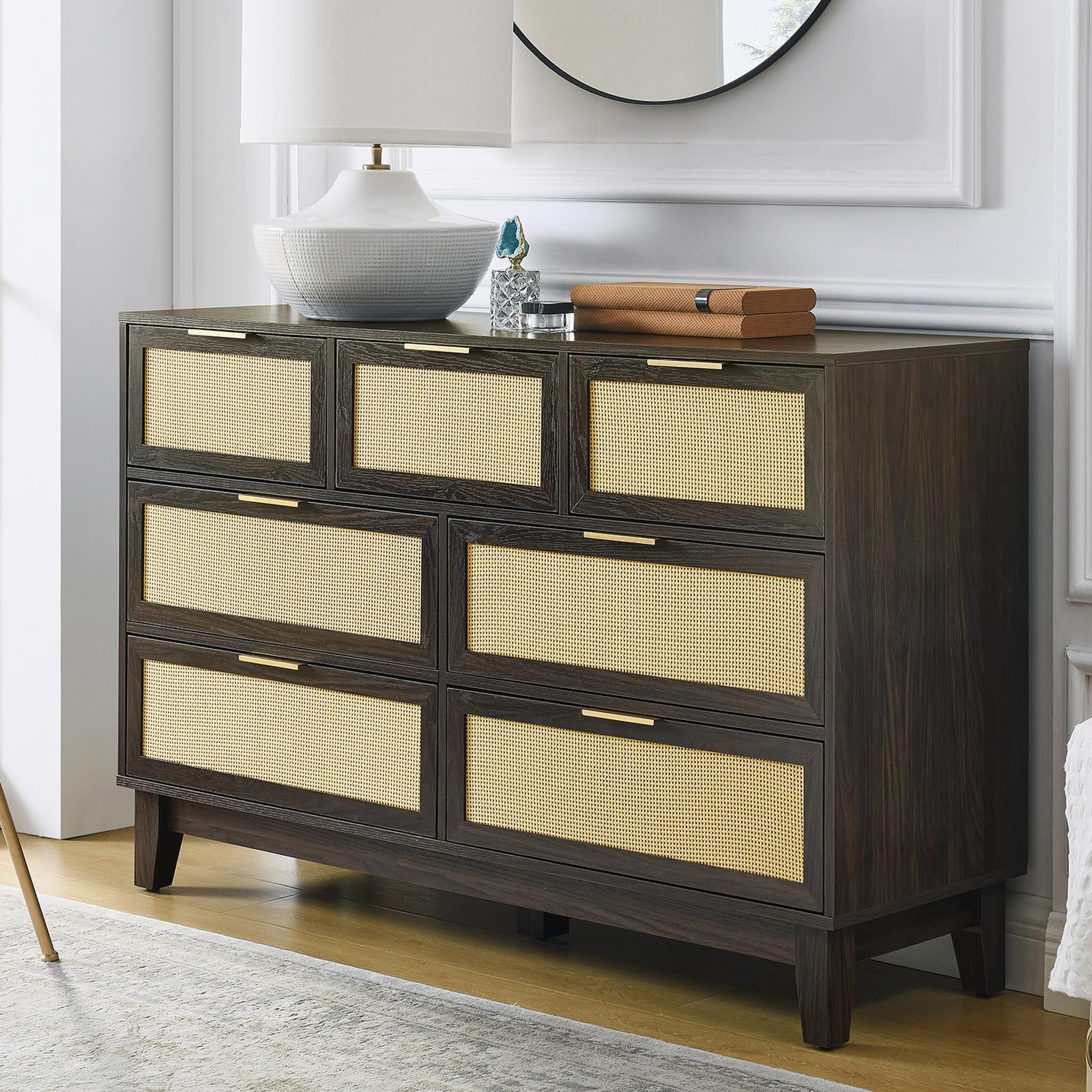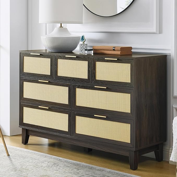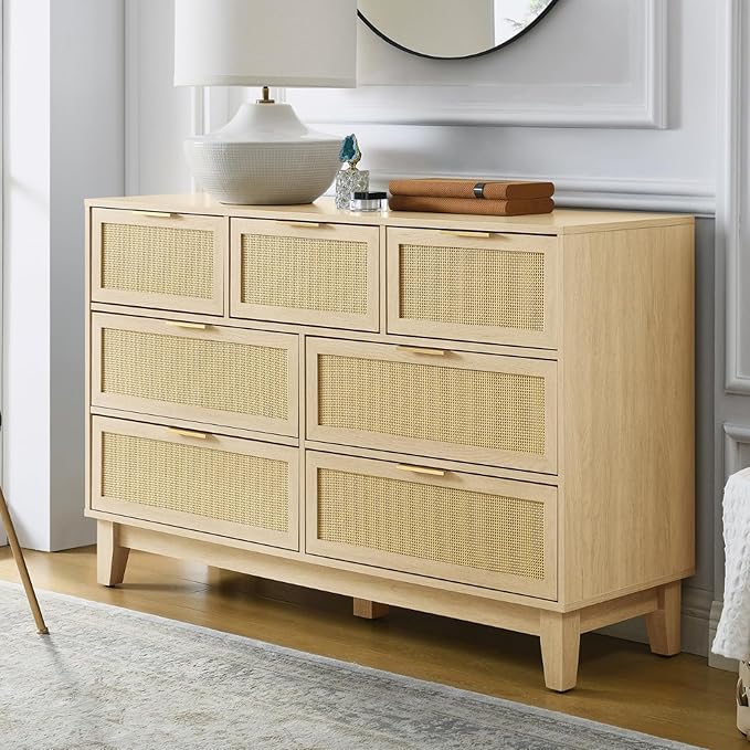 Dresser for Bedroom, Rattan Dresser with 7 Drawers, Wide Boho&Farmhouse Chest of