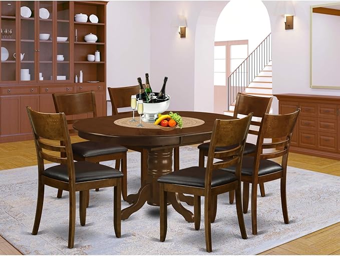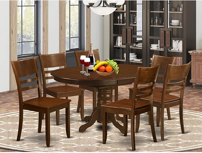 - kitchen SET: Our elegant kitchen table set consists of a dining table with an oval butterfly leaf and 6 modern dining chairs. This sophisticated 7-piece set adds a touch of refinement to your dining area or kitchen. The kitchen table set, available in a rich color finish, is suitable for any type of kitchen or dining space. With sturdy Asian Wood legs and high-quality upholstery, these dining chairs are both stable and stylish.