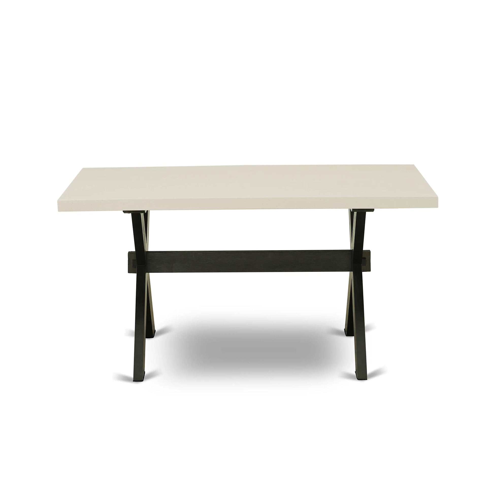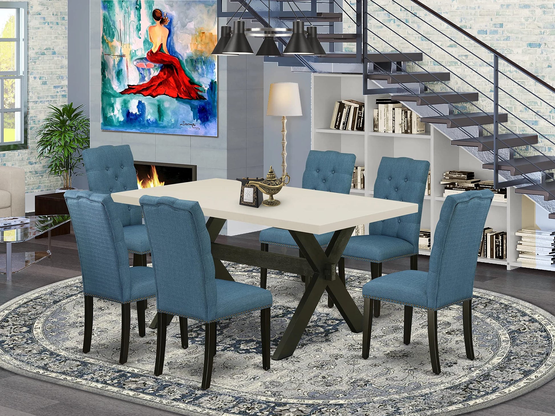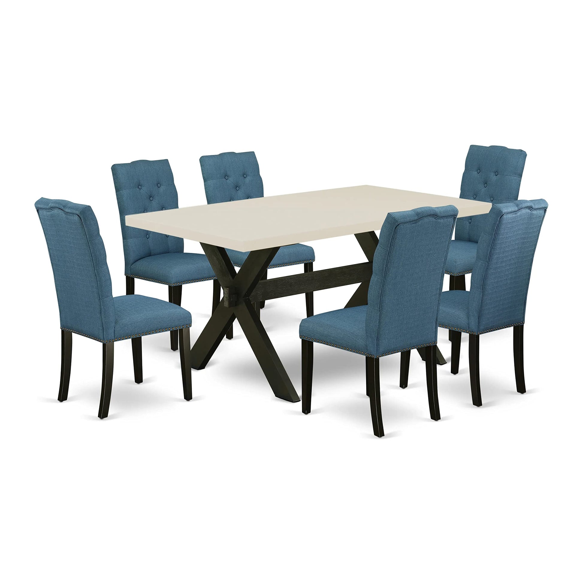 East West Furniture X-Style 7 Piece Room Set Consist of a Rectangle Kitchen Table with X-Legs and 6 Blue Linen Fabric Parson Dining Chairs, 36x60 Inch, X626EL121-7