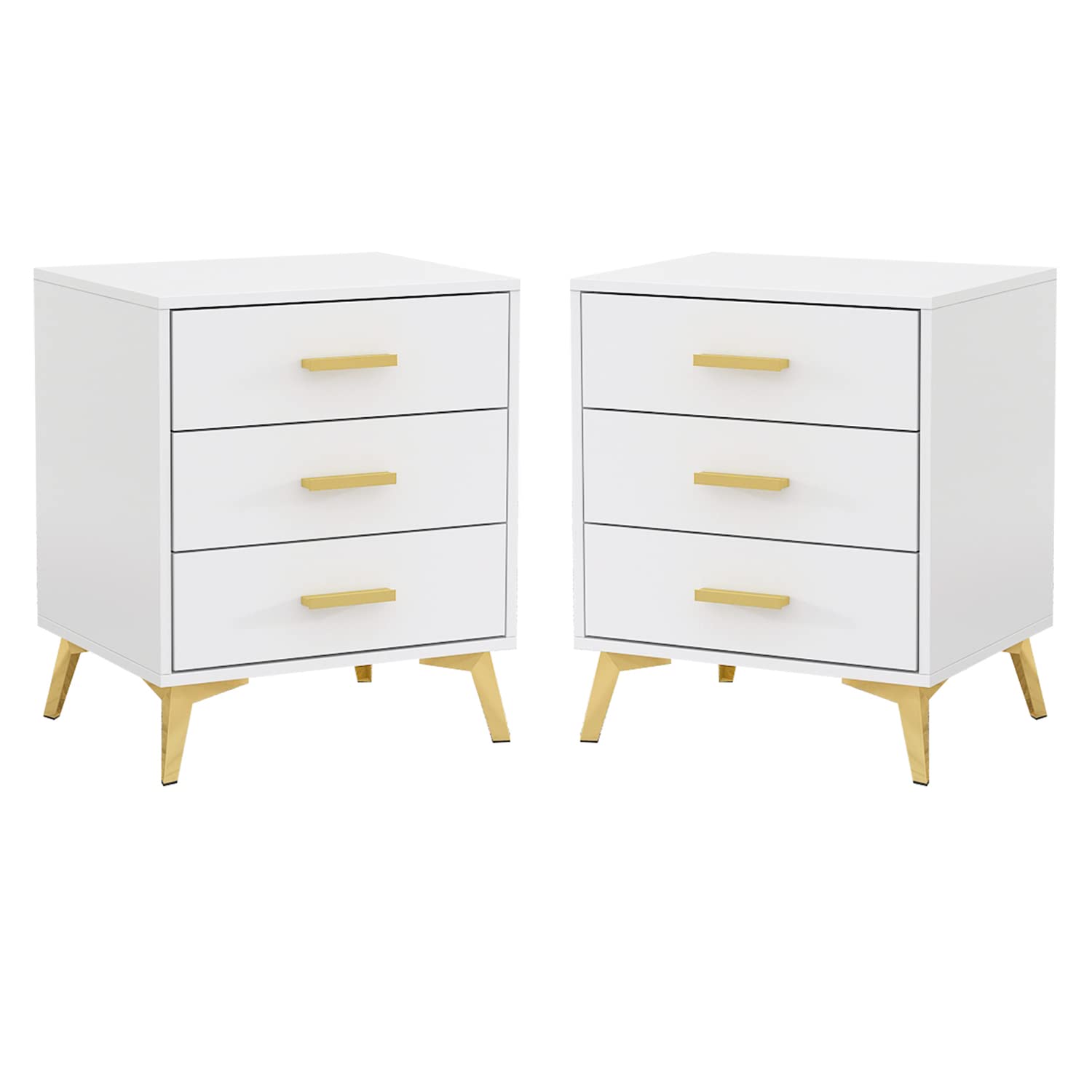 Set of 2 Nightstands with 3 Storage Drawers & Gold Metal Legs, Modern Bedside
