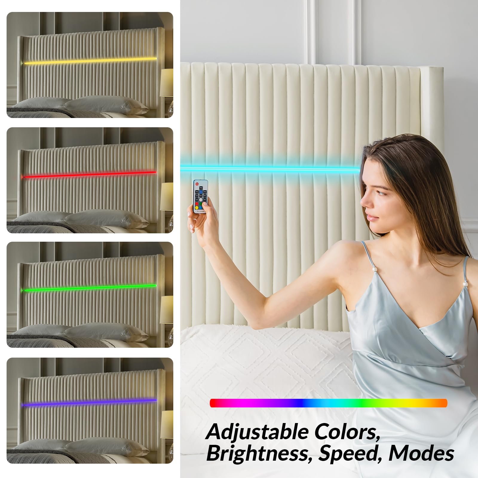 - RGB Colors LED Light - The queen bed frame with led lights comes with adjustable LED light on the headboard. You can adjust the colors with the remote control, when you rest in bed. We have carefully selected warm light to protect your eyes, convenient for you to read, watch TV, and work at deep night.
