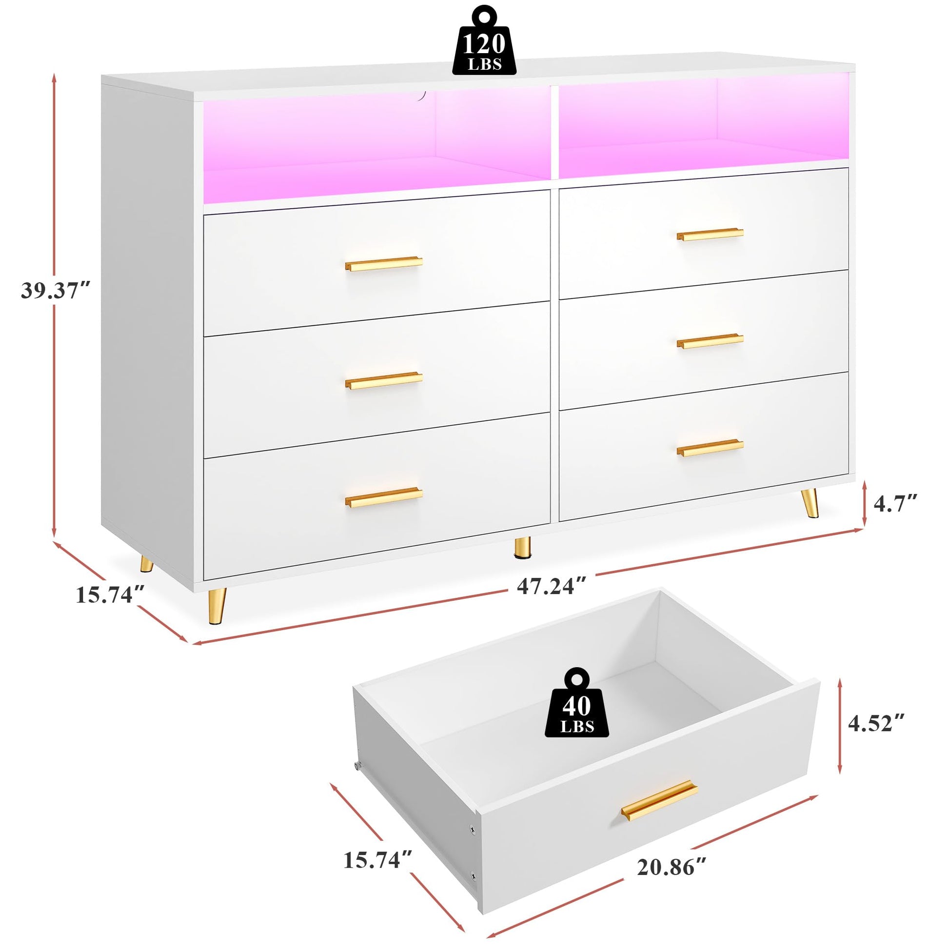 - White Dresser with16 RGB Colors LED Light The beautiful LED light will make your home looks more modern , fashionable and adds a soft and warm atmosphere. Make the bedroom dressers more unique and attractive. The bedroom dresser for closet is equipped with LED lights strip with 16 color modes and you can control its color with button. You can choose the color you like according to your needs and scenes.