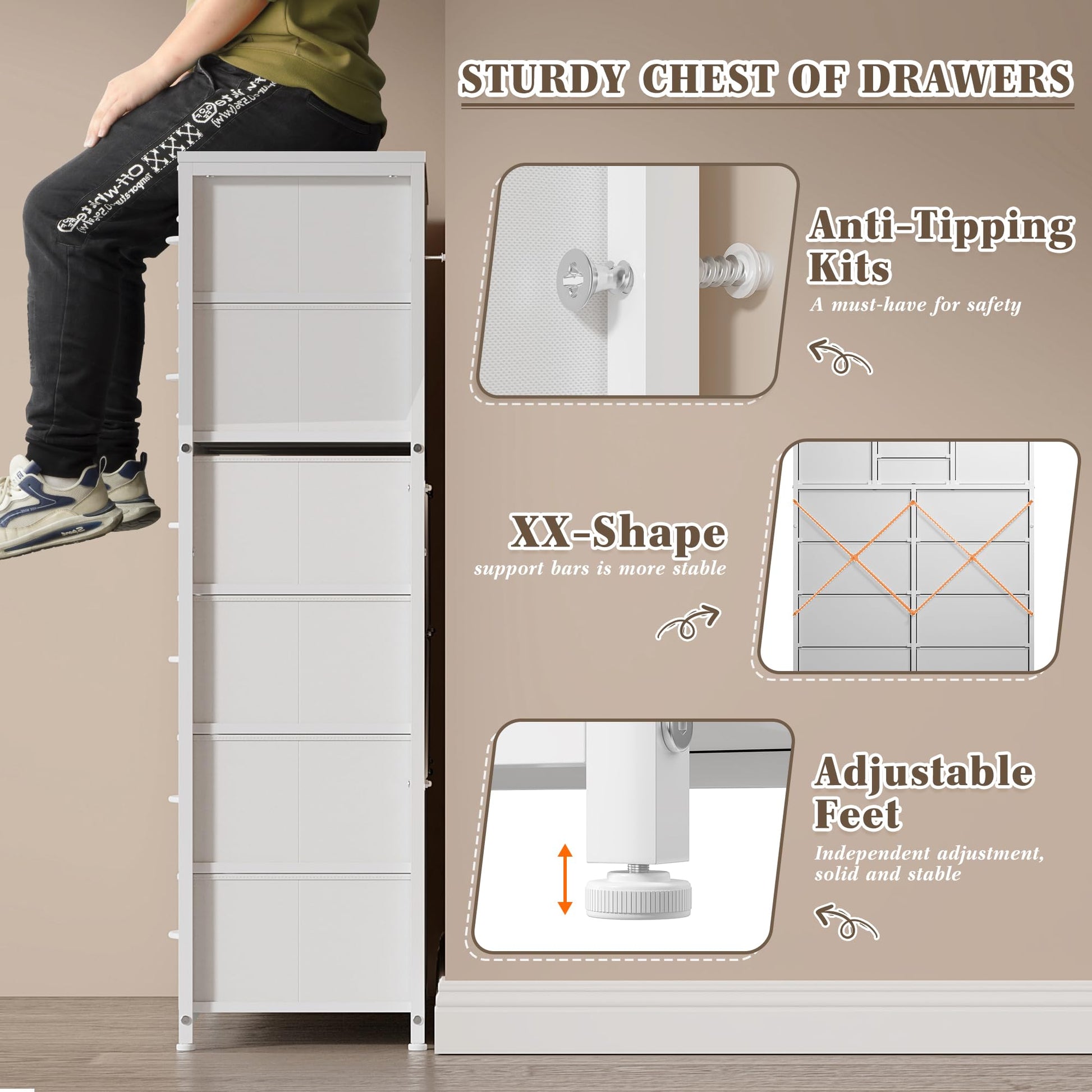 - "DOUBLE X" SUPPORT BAR DESIGN OF THE TALL DRESSER The structure of tall dressers & chests of drawers is made of advanced metal and wood boards, and the "double X" support bar is designed on the back to provide strong stability and bearing capacity for the large dresser, and each small drawer can accommodate at least 15-18 hats, medium drawer can accommodate at least 9-11 long sleeves, and large drawer can accommodate at least 16-20 shirts.