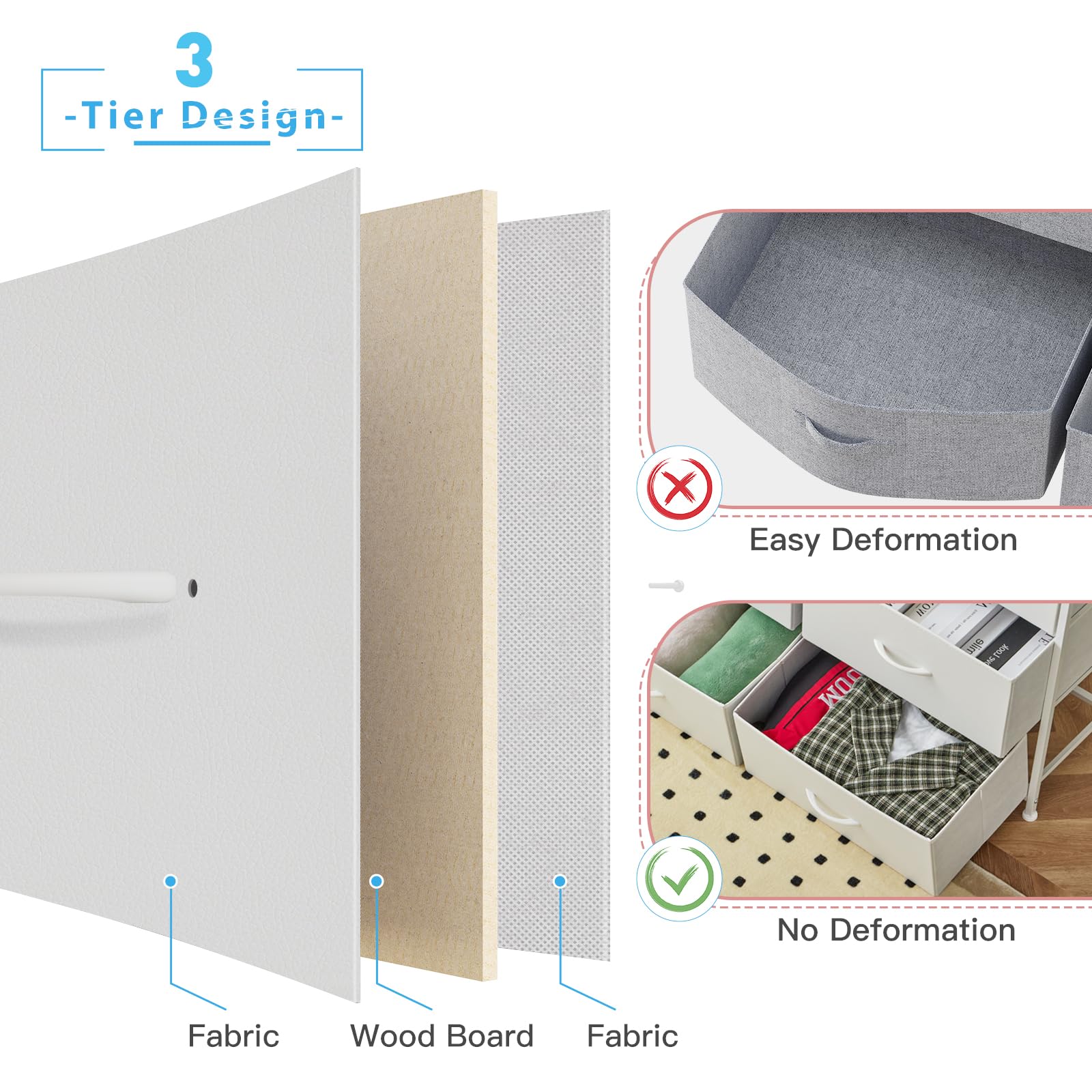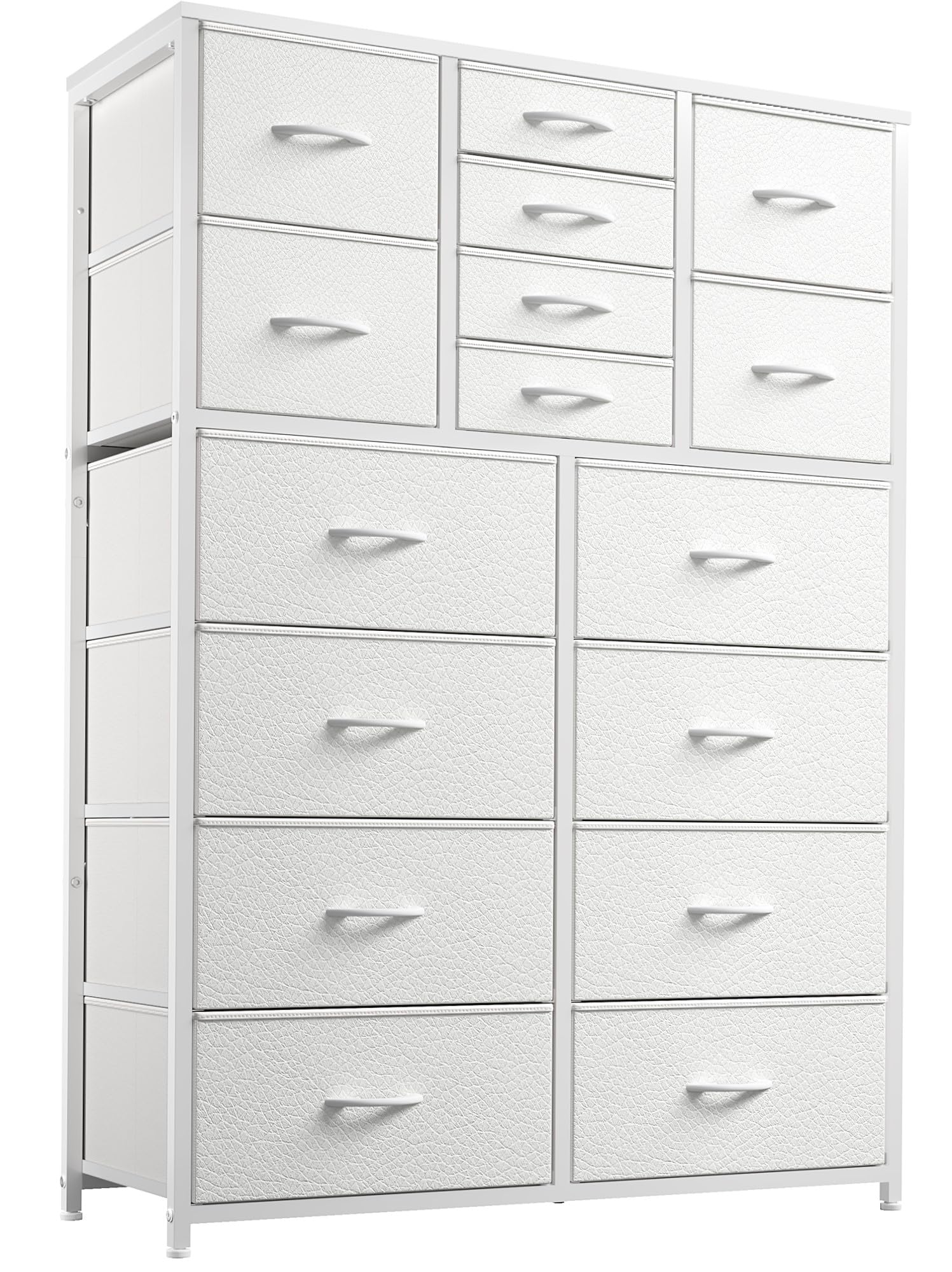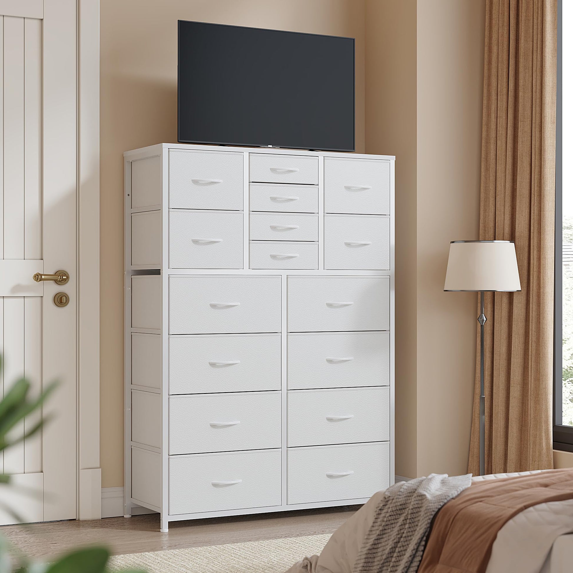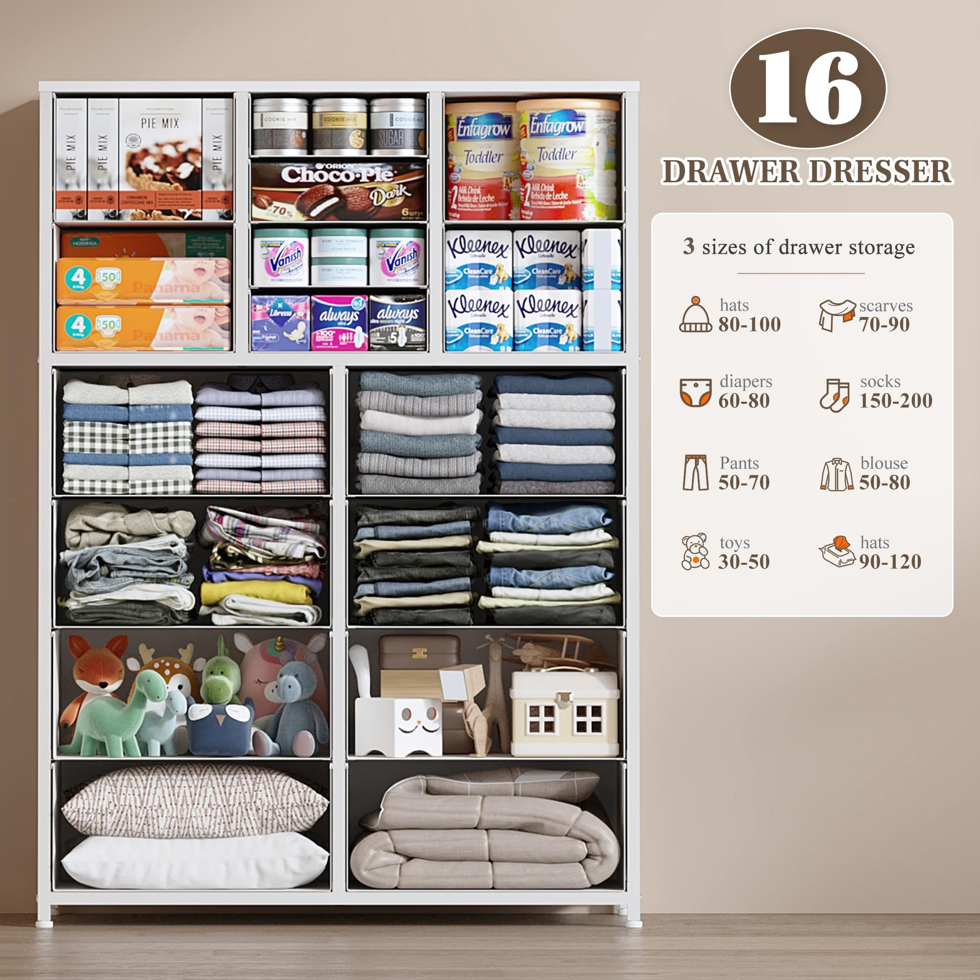 16 DRAWERS DRESSER FOR BEDROO The size of this white dresser for bedroom is 57.1 "X 37.4" W X 11.8 "D. 16 fabric drawers dresser not only takes up less space, but also provide enough storage space to store clothes, scarves, socks, T-shirts, pants, sunglasses and toys. Keep your room clean and tidy all the time.