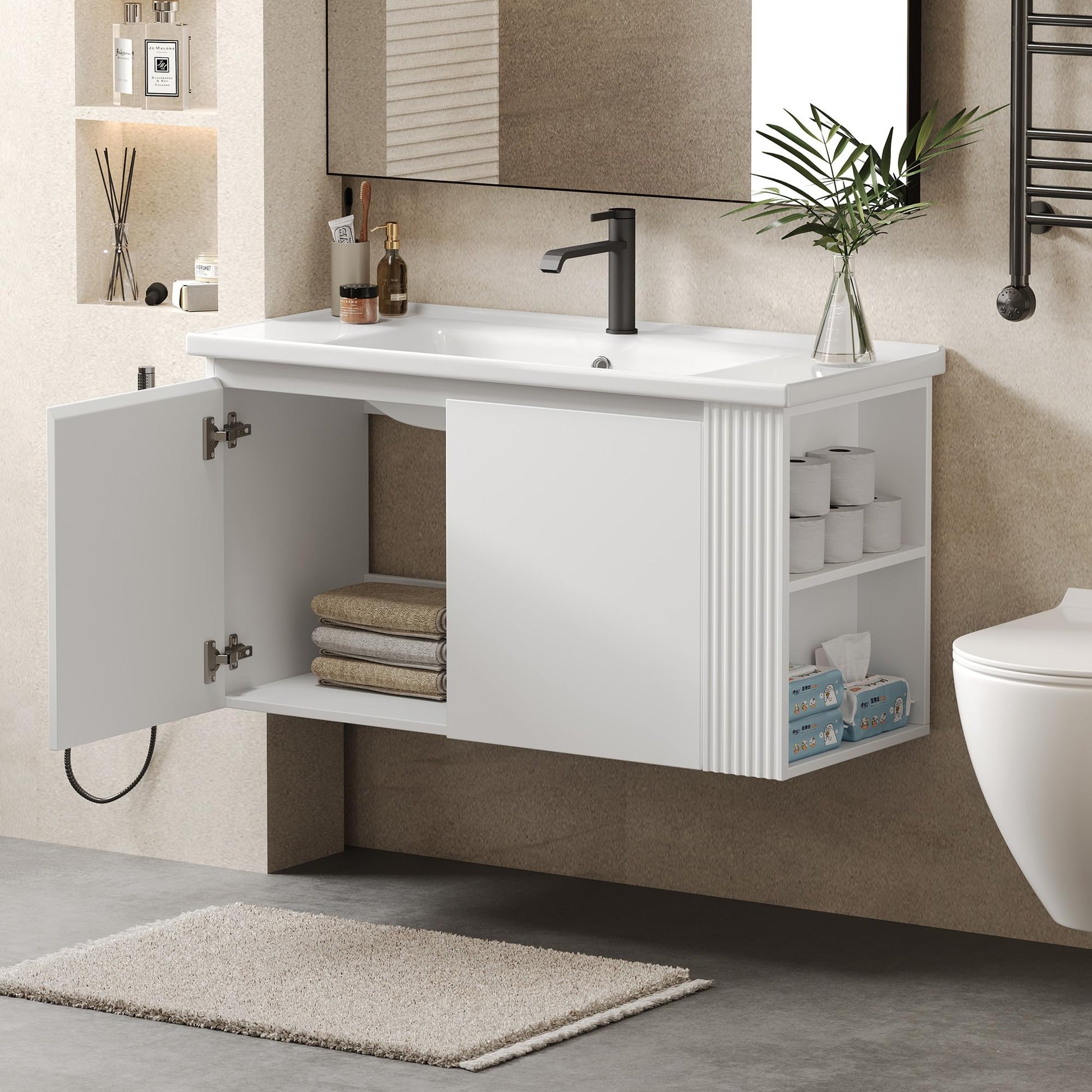 - Ample Storage Functionality: Enjoy ample storage space with 2 side open shelves, this 36 inch wall-mounted bathroom vanity is perfect for organizing toiletries and other essentials. Soft close doors offer a quiet and smooth operation, adding a touch of luxury to your daily routine.