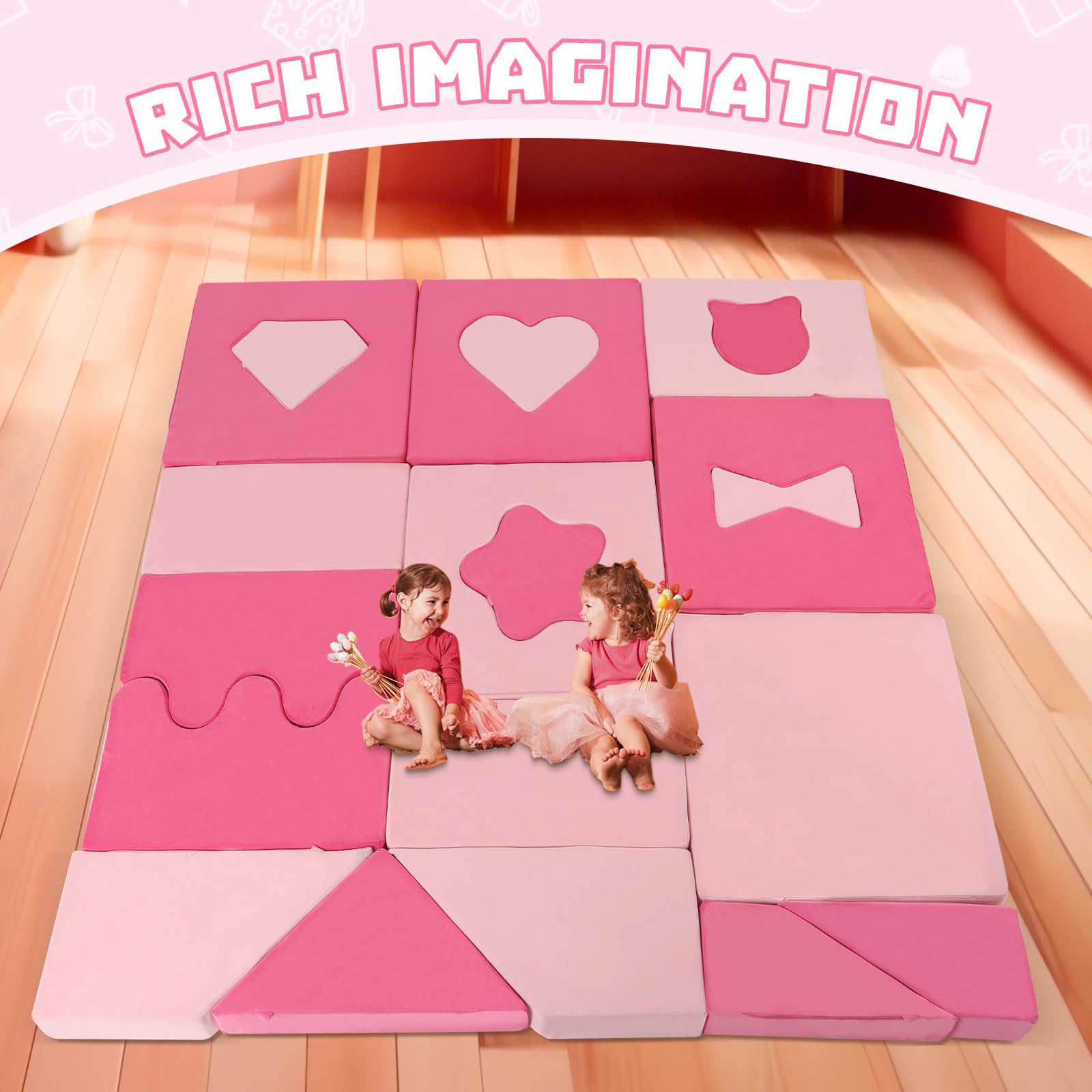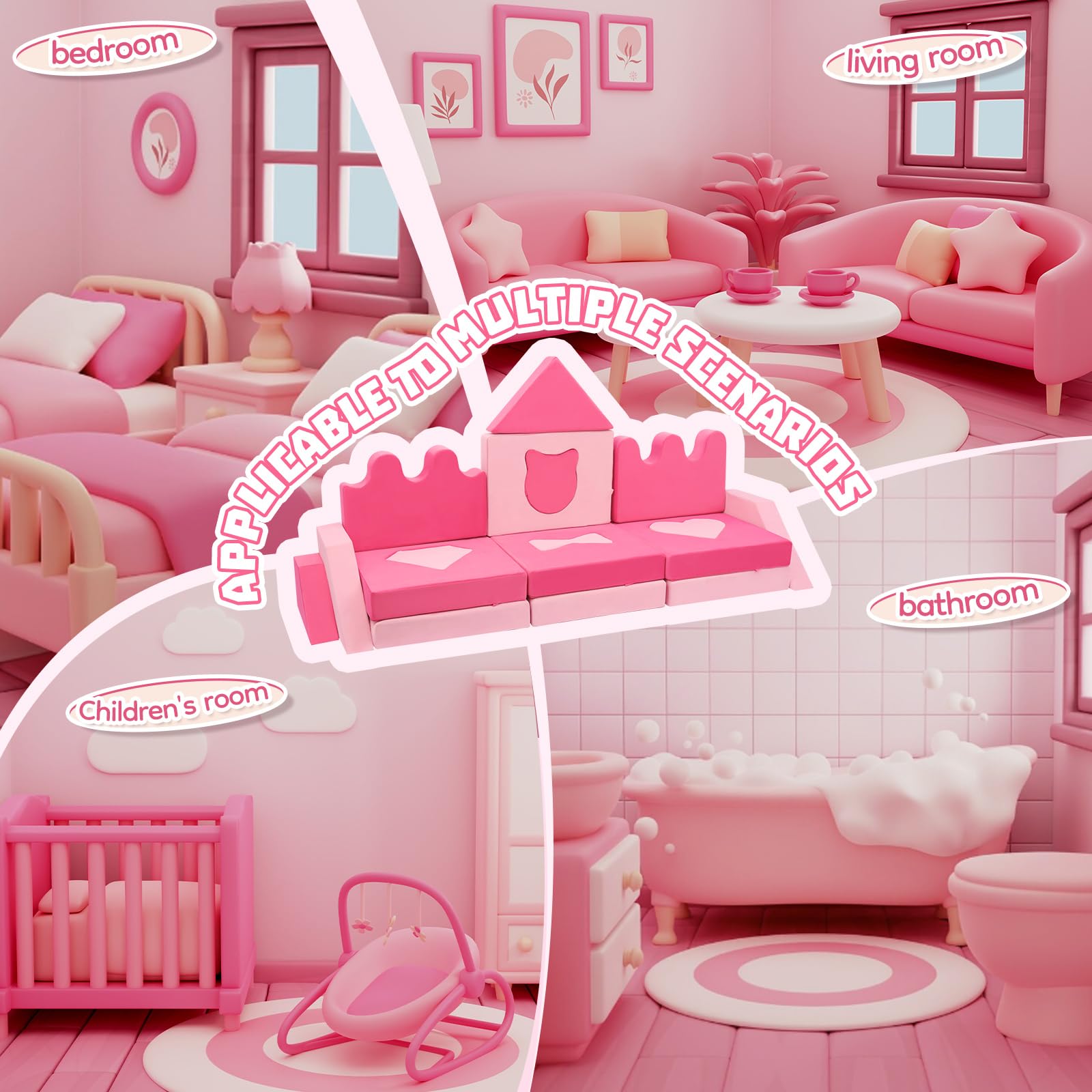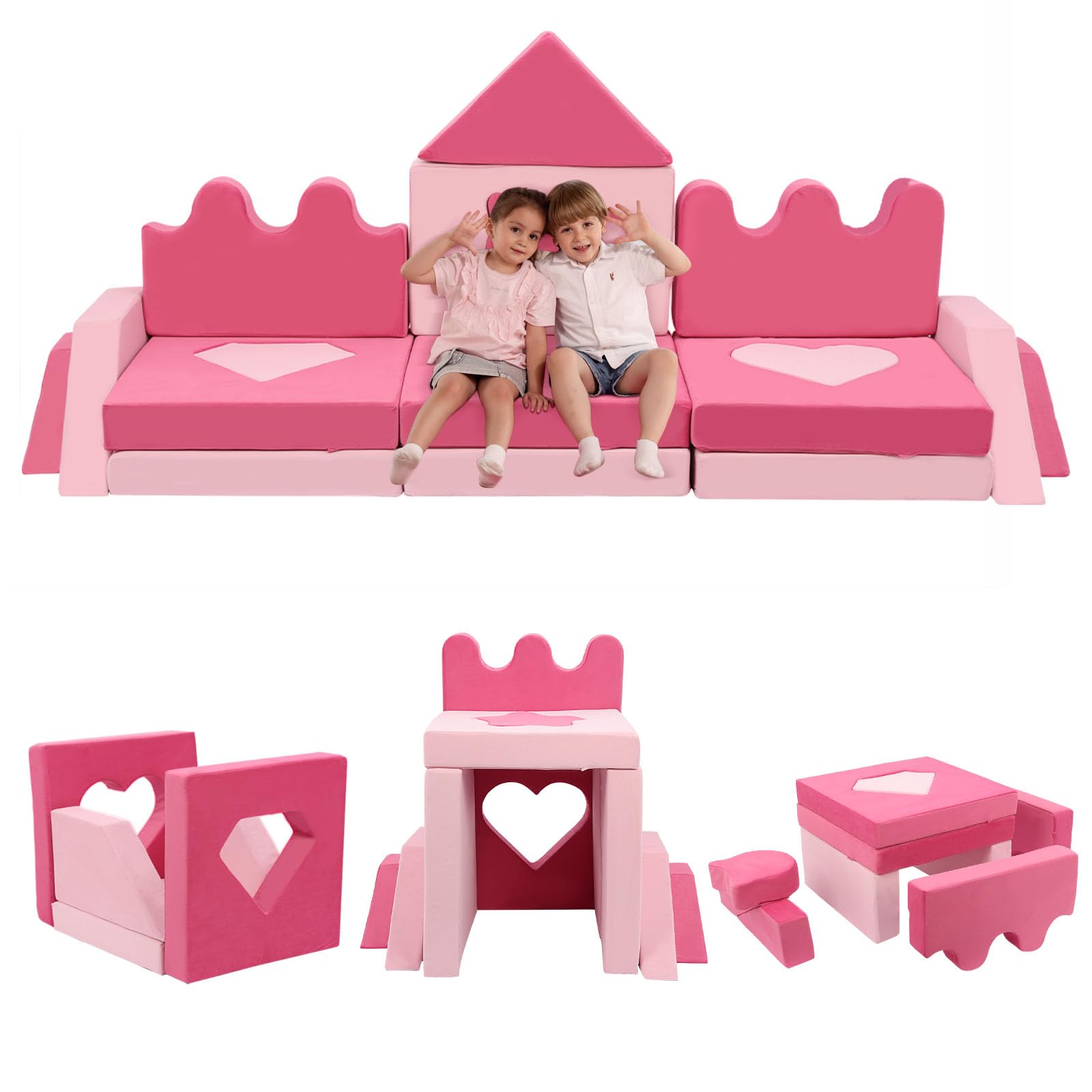 - 20 Piece Pink Kids Sofa : This toddler couch set offers 30 different shapes and 20 pieces,including Castles*2, Square with a butterfly shape*1, Square with a diamond shape*1, Irregular shapes*2, Triangle shape*1, Five-pointed stars hape*1,Cat head shape*1, Hollow square with heart shape*1,Diamond shape*1,Square module*1,Hollow rectangle with cat head shape*1,Irregular module*2, Hollow square with five-pointed star shape*1, Rectangular shapes*2,Love module*1,Bow tie module*1.