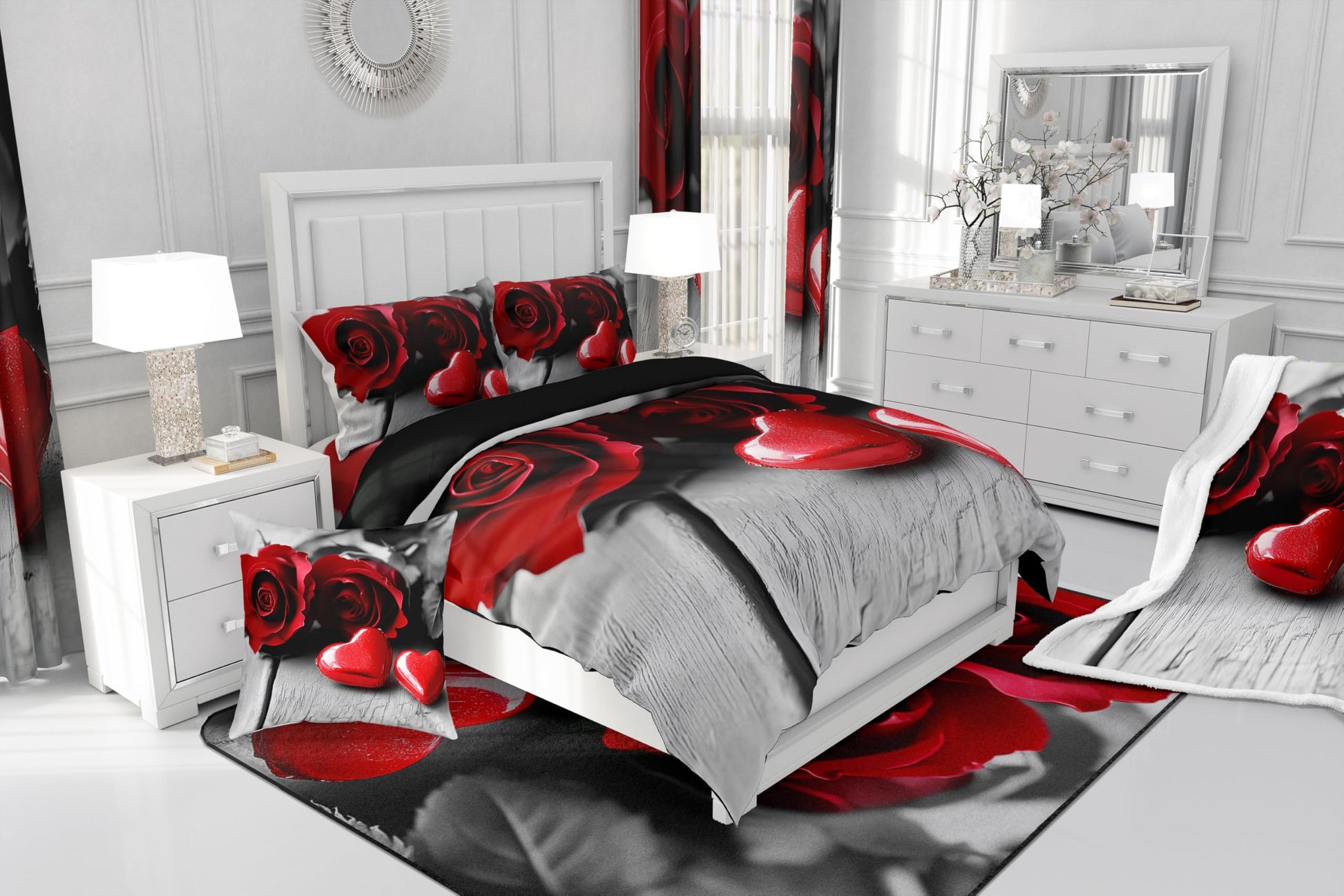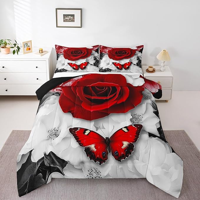 Grey Red Floral Rose King Comforter Set,Gothic Romantic Flower Rose Bedding Set