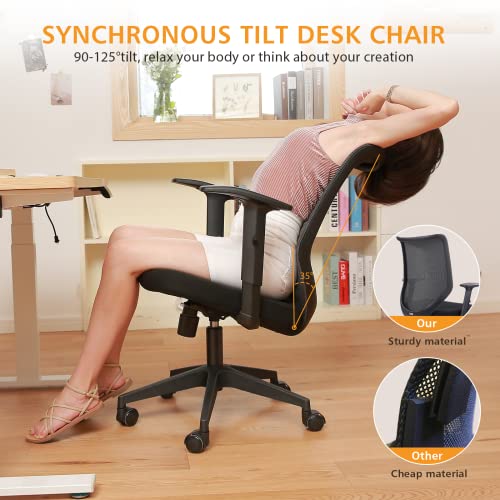 - ADJUSTABLE COMFY DESK CHAIR: Soft seat cushion molded from a whole piece of foam instead of cheap re-bonded sponge. Skin-friendly fabric, breathable mesh, offer a cool comfortable sitting for 10 hours. 360° swivel rolling chair has height adjustment, 90-125° synchronous tilt. PU cushioned armrests have 11 height adjust to support your arms. The home office chair can be pushed under the desk to save space
