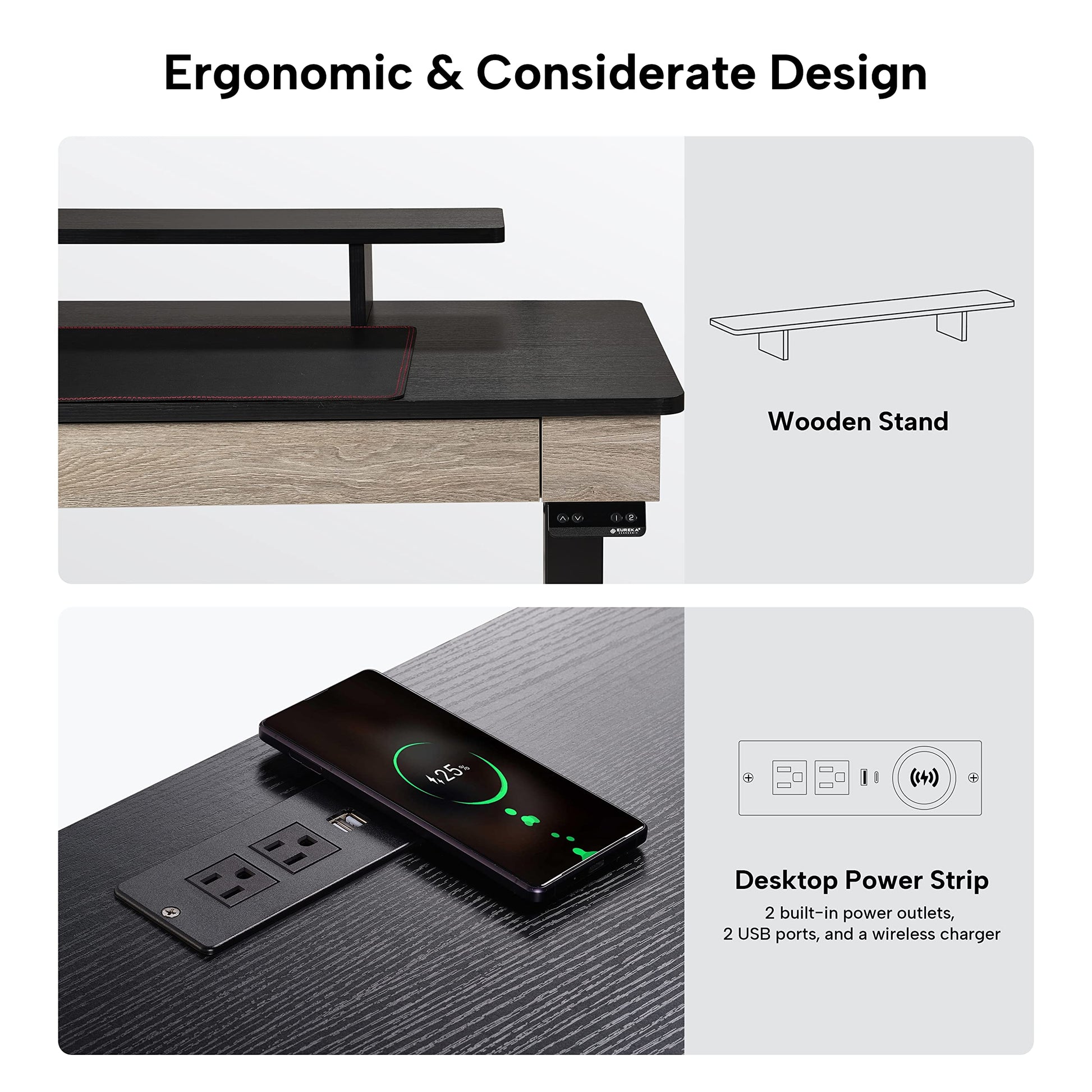 - Built in OutletsThis EUREKA ERGONOMIC sit stand desk has 2 built-in power outlets, 2 USB ports, and a wireless charger on the desktop, and 2 USB ports on the control panel, convenient to charge your laptop, mobile phone, or anything else