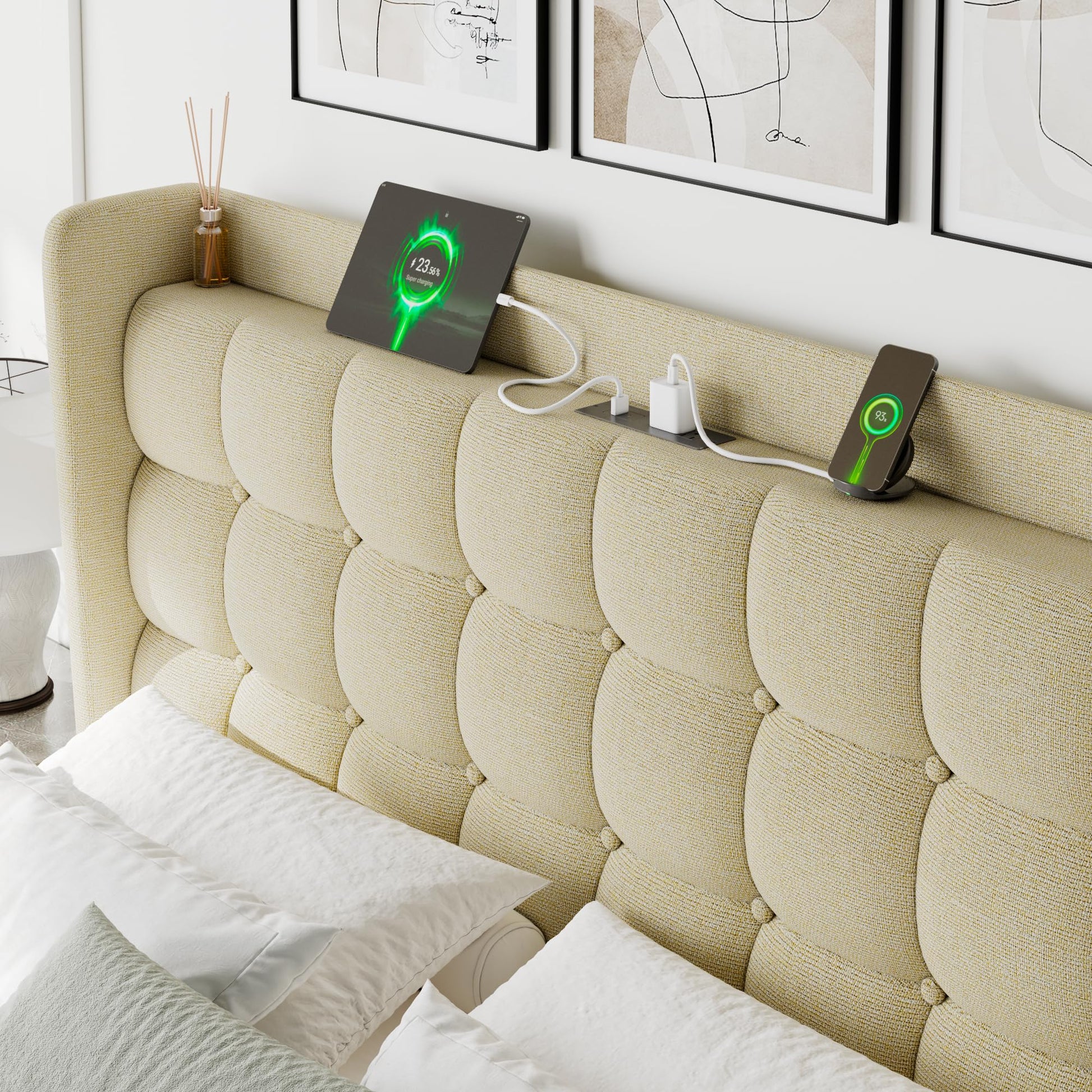 Queen Bed Frame with Charging Station, Upholstered Platform Bed Frame with Wingback
