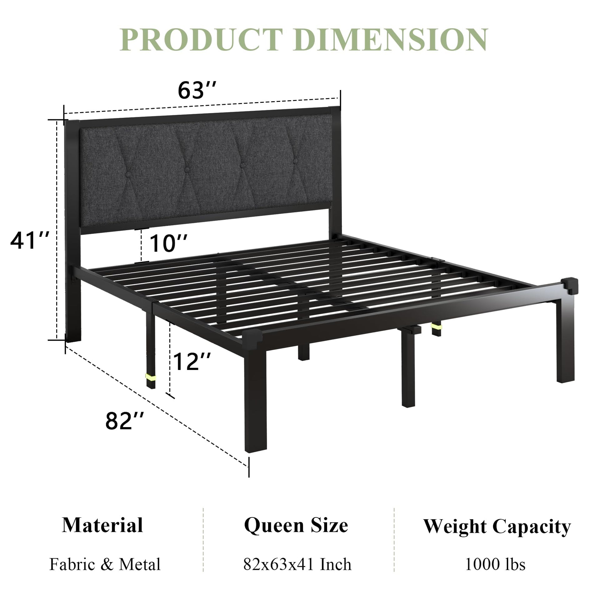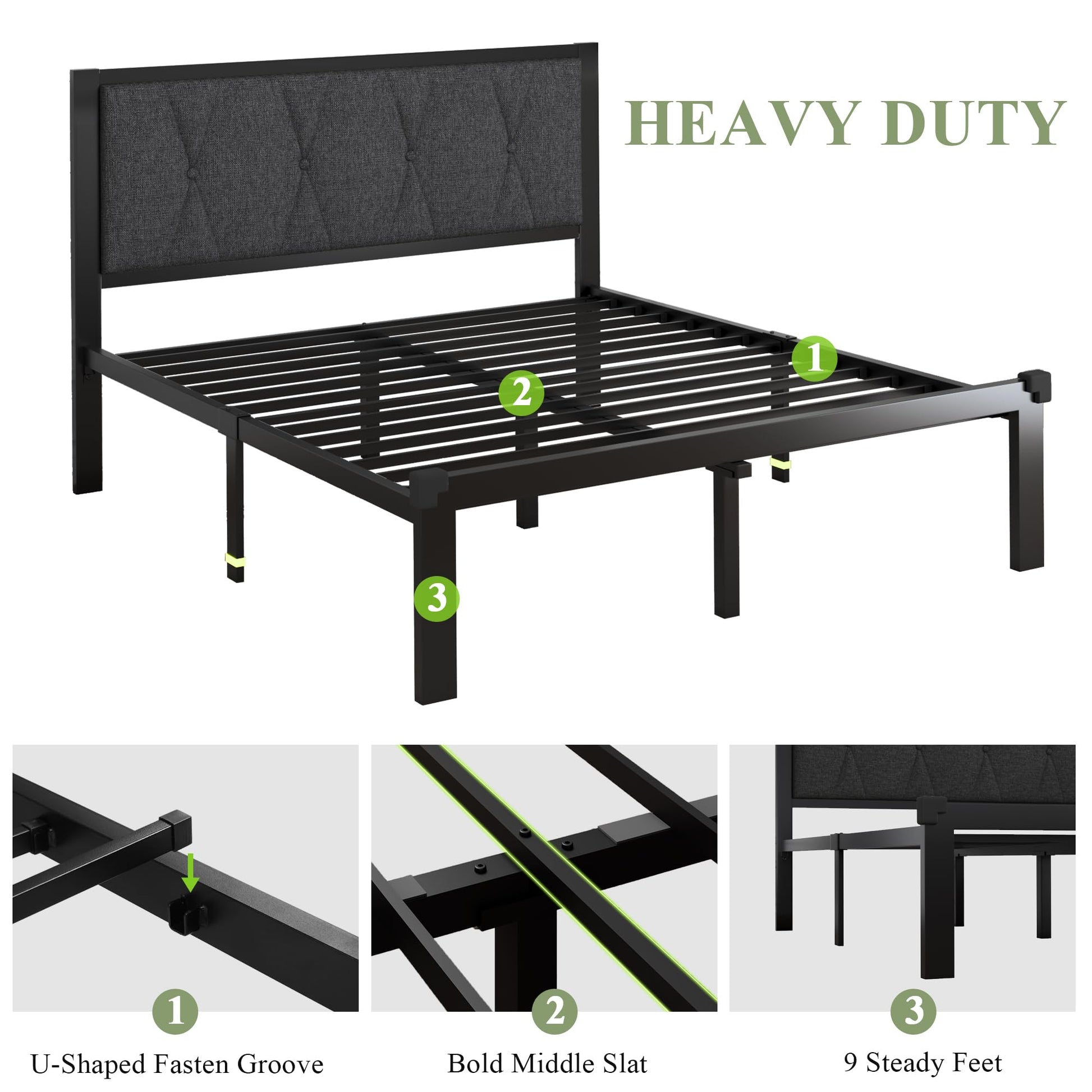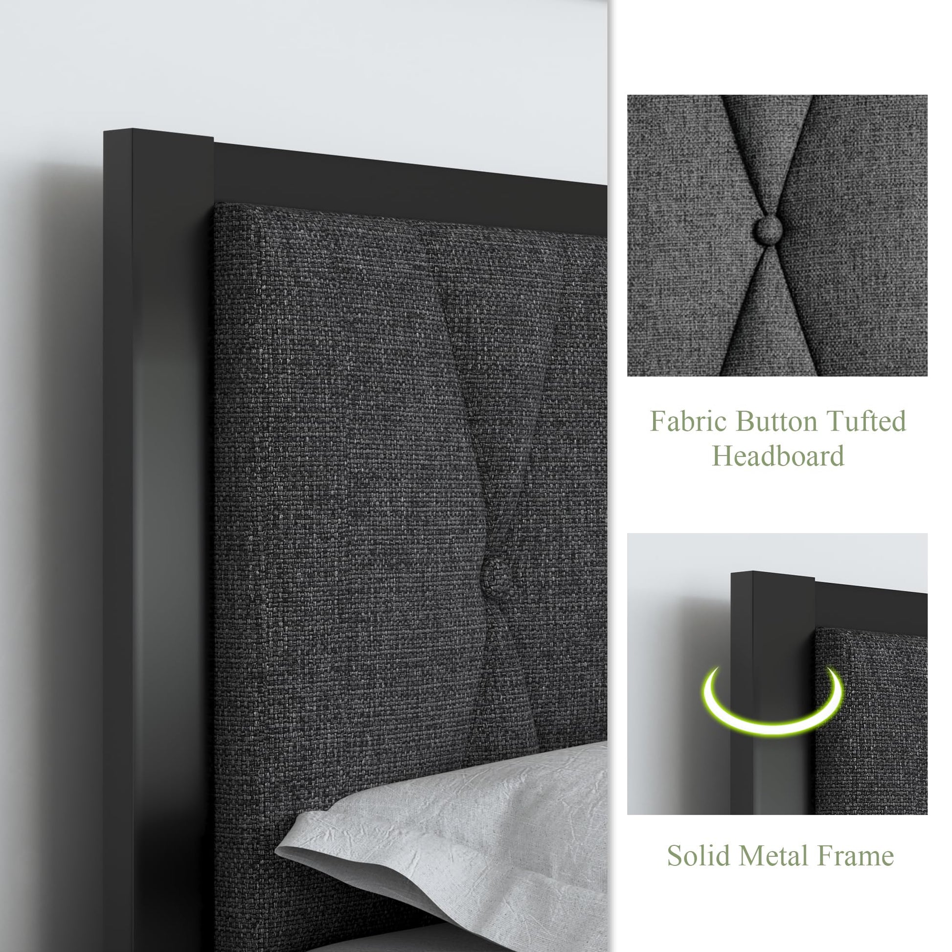 Queen Size Metal Bed Frame with Fabric Button Tufted Headboard, Platform Bed Frame