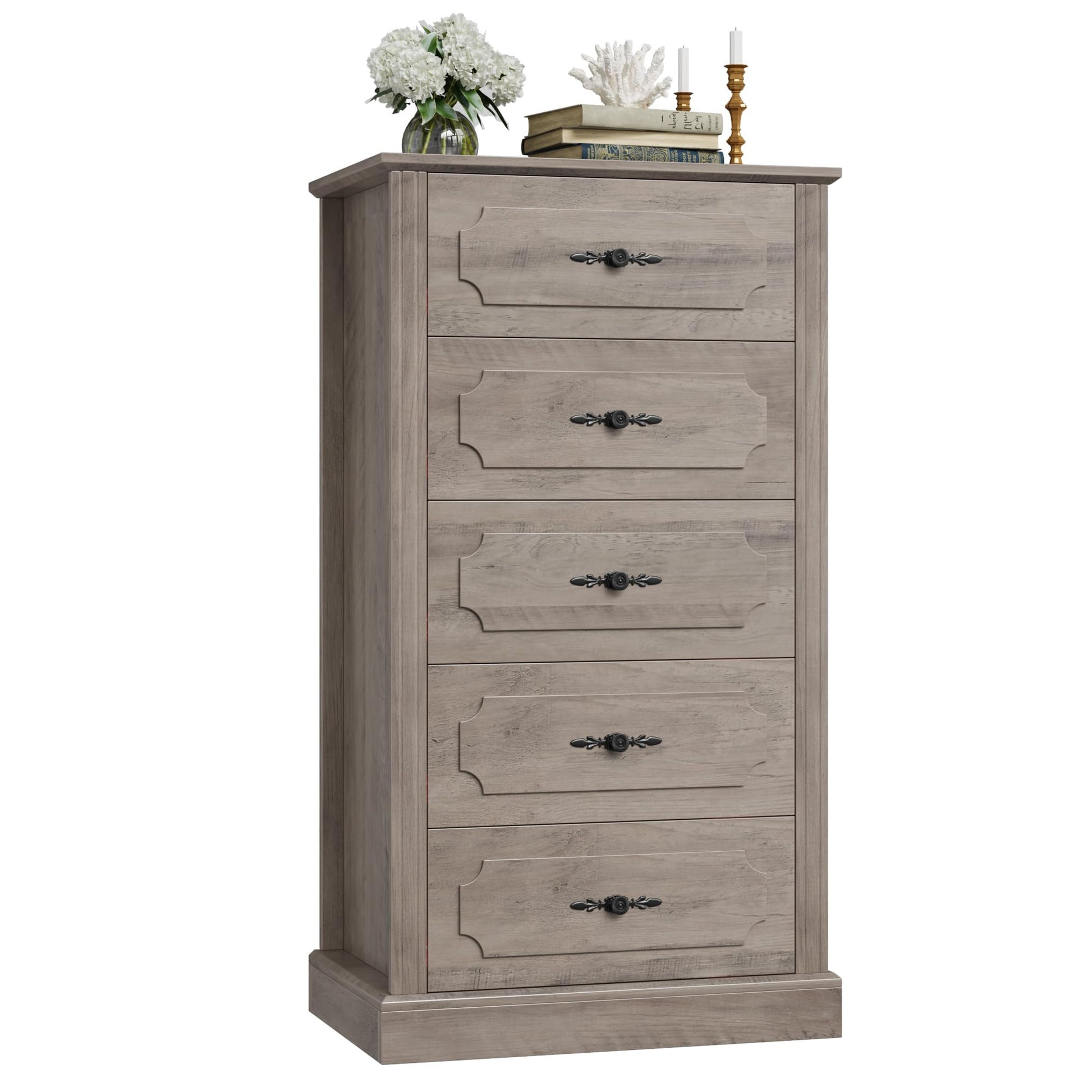 5 Drawer Grey Dresser, 43" Wood Dresser Samll Dresser Chest of Drawers with Large Storage Space,