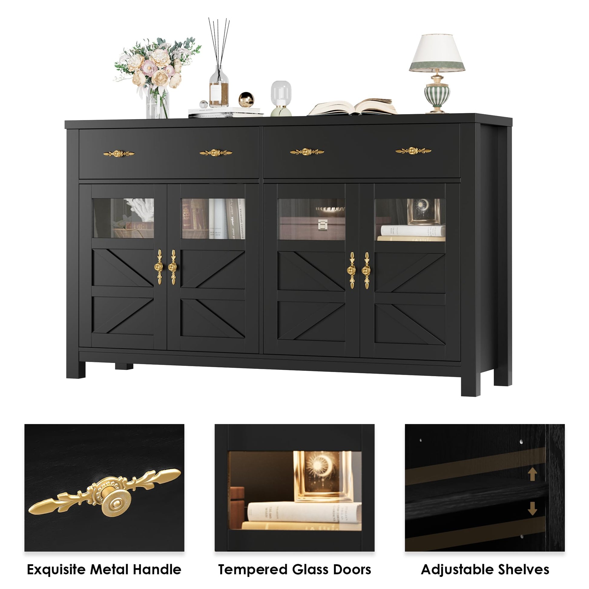 - Finished in pure black, tempered glass doors and embellished golden handles, buffet cabinet gives a touch of mystery, luxury, and modernity. The seamless integration of the wood grain and stylish barn doors creates a visually striking and lively sophisticated vibe.
