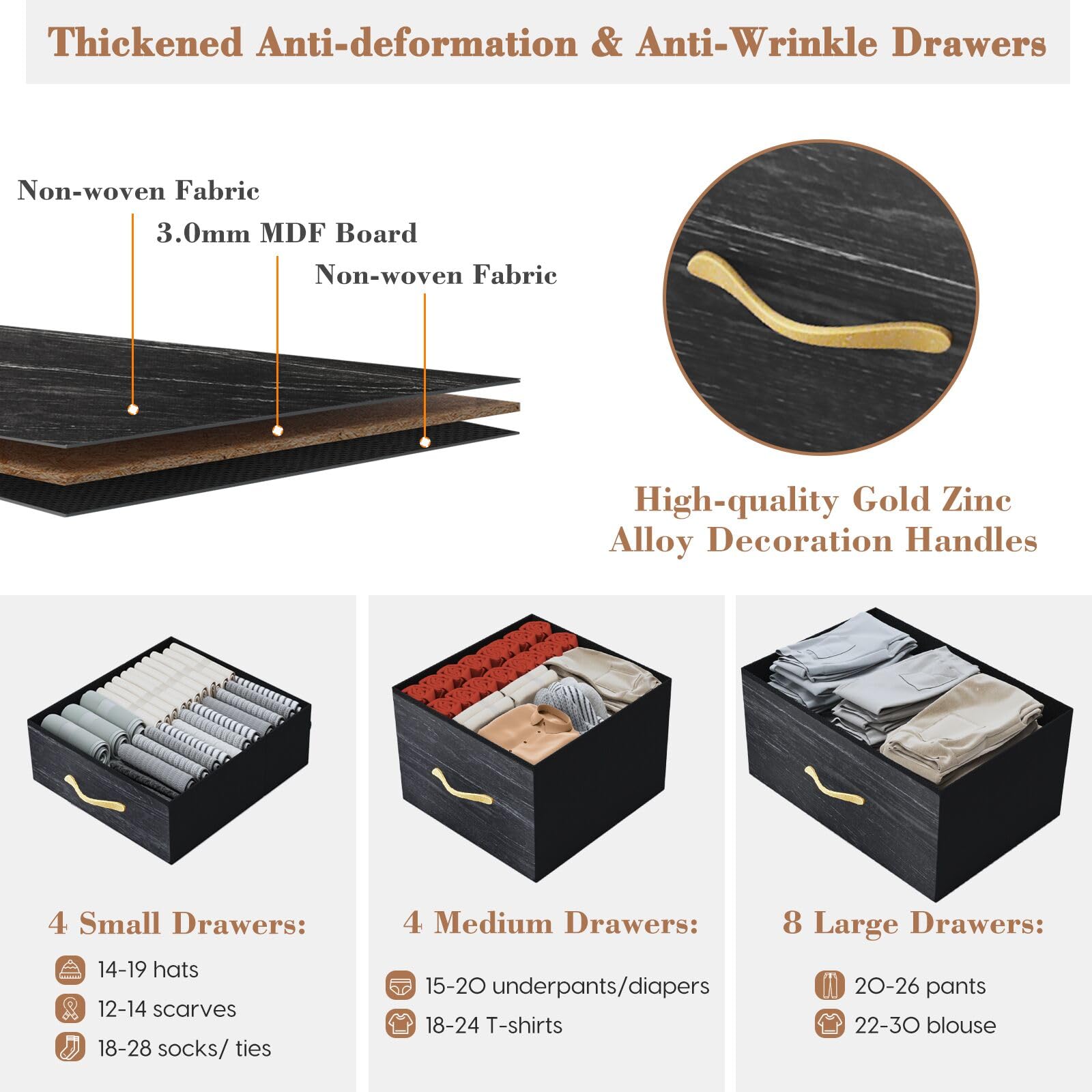 - The tall dressers include 8 large drawers, 4 medium drawers and 4 shallow drawers, which made high density fabric+ 3.0mm MDF, not only provide super load bearing and Anti-Deformed, but meet your classified storage need: 4 shallow drawers can be used to store your jewelry, underpants, underwear, socks etc,. 4 medium drawers can be used to store shirts, diapers, scarves etc, and 8 large drawers can be used to store pants, stuffed toys etc.