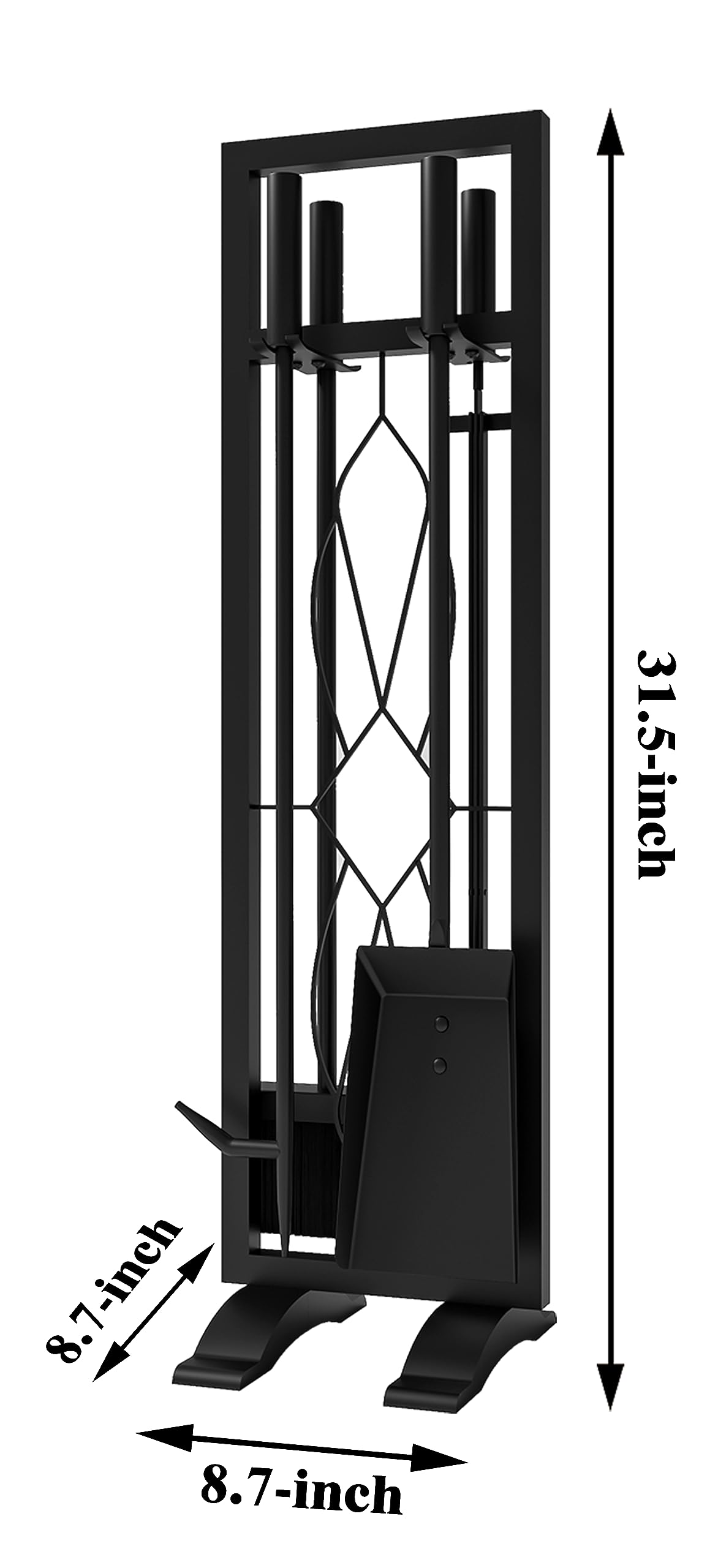 - ALL IN ONE-5 PIECES TOOL SET: The fireplace tool set come with sturdy stand with heavy duty base, broom, shovel, tong and poker, all 5 pieces in one set. Unique ring design at the top of the stand for easy movement.Three-jaw tong for a more balanced grip and easier movement of wood. Measures 32.3 inch high fire place tools sets, works great with most fireplace screens, fireplace log holders and firewood logs racks, fireplace ash buckets, fireplace bellows, fireplace grates.