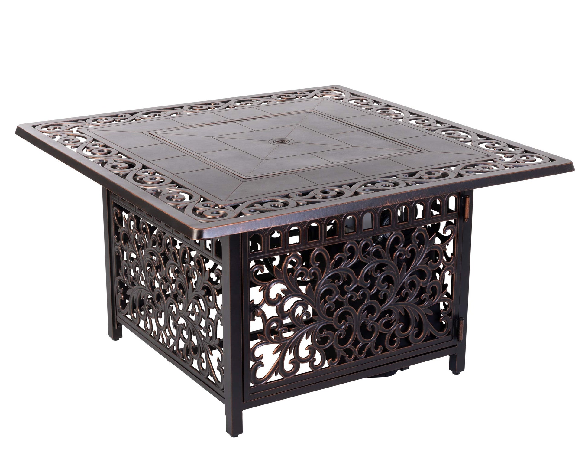 - Compatible with any contemporary or traditional outdoor decor, the Sedona Square Aluminum LPG Fire Pit features a cast-iron-style scrollwork motif complemented by a Antique Bronze finish. With a practical aluminum build and an output of 55,000 BTU, this versatile fire pit pulls double duty as a patio table – just add the included fire bowl lid with handle.