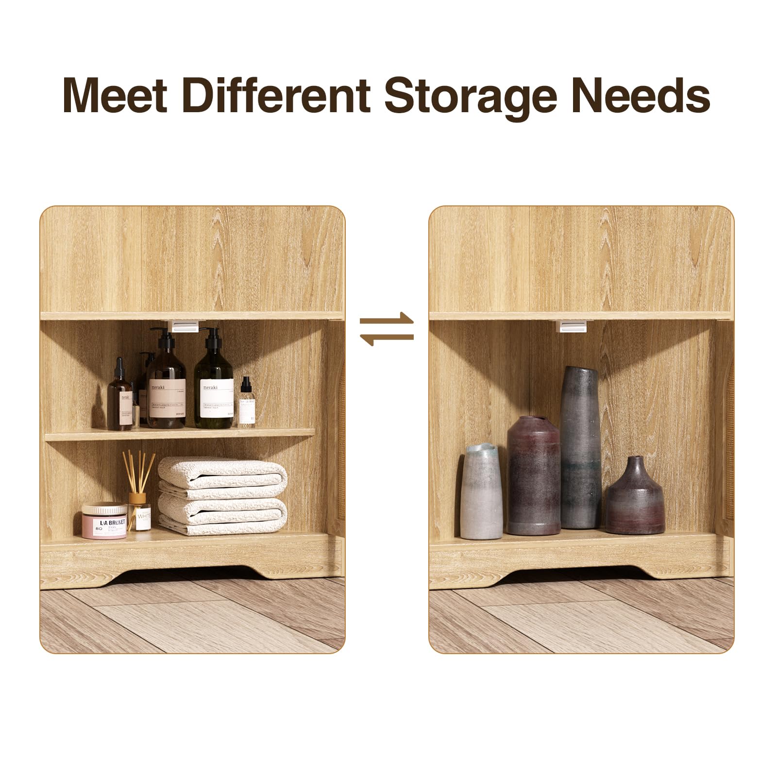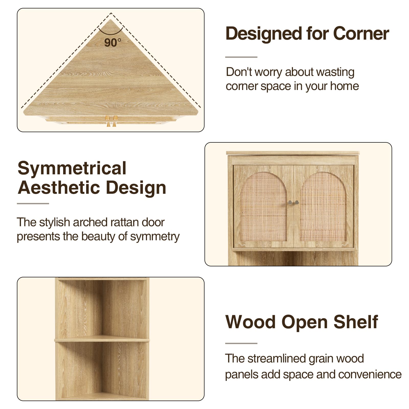 FiveWillowise 67''H Tall Corner Cabinet with Handmade Rattan Door, Rattan Storage Cabinet with Adjustable Shelves, Corner Bookshelf Space Saver for Barthroom, Kitchen, Natural