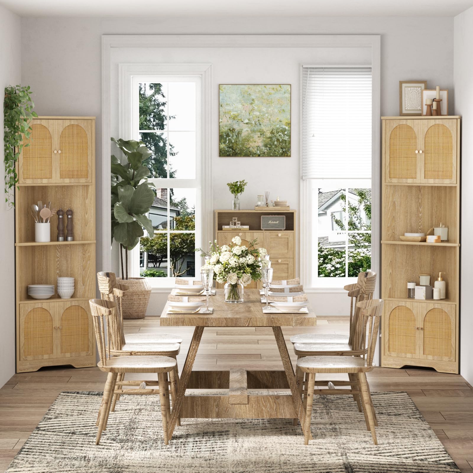 - Handmade Rattan: kitchen corner cabinets carving out exquisite arched rattan double doors while maintaining the natural wavy texture of the material. The open wooden corner shelves can be paired with green plant decorations or shell elements. These handmade elements together create a living space that is both ethnic and full of personality