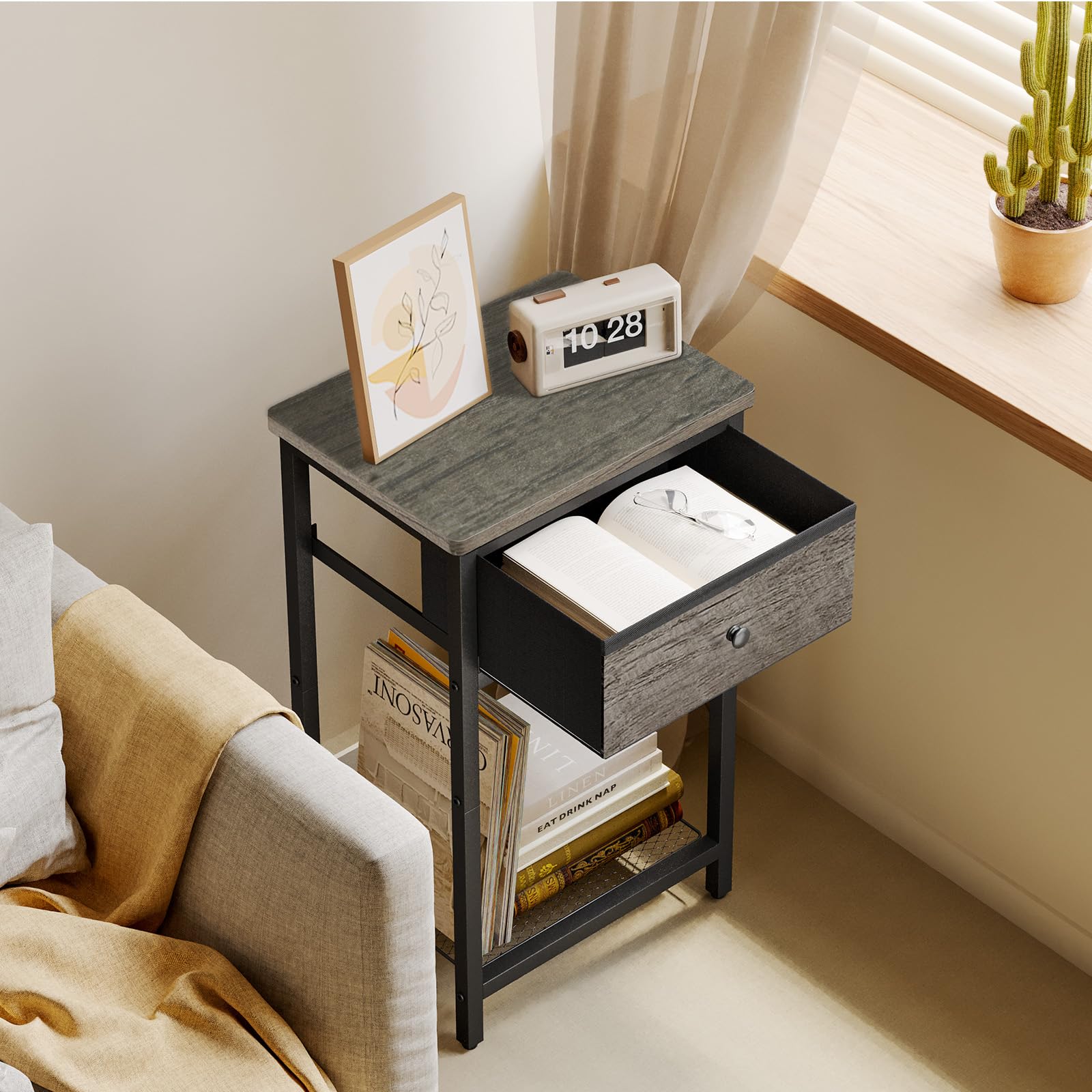 - The industrial look of the black steel frame is complemented by the retro top of the end tables, which can be perfectly matched with any different style. The greige bedside table looks dignified and elegant in your bedroom, making your room more pleasing to the eye.