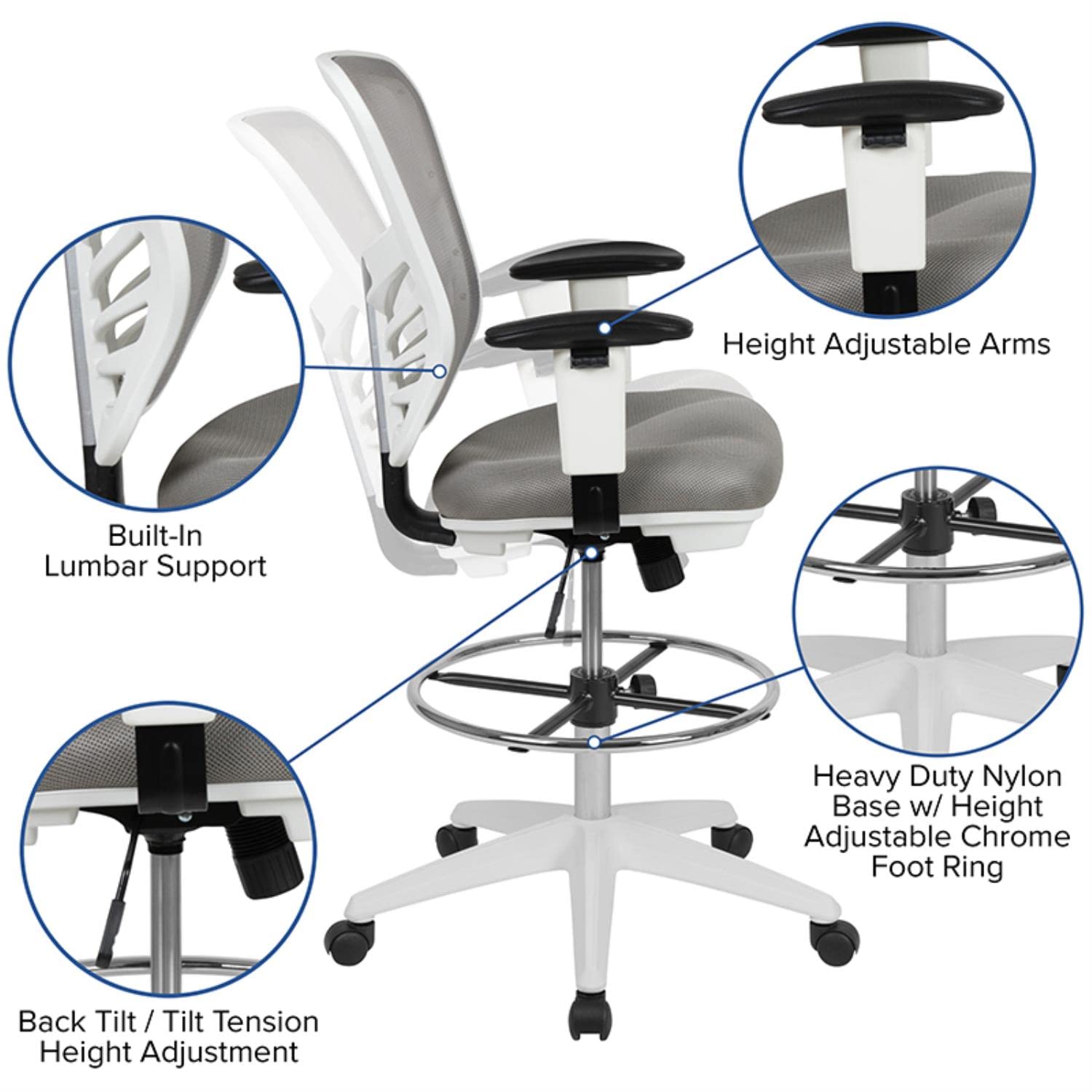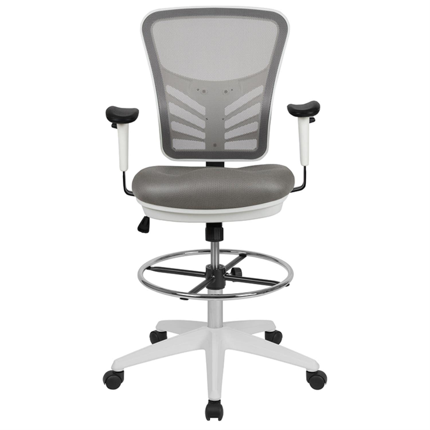 Mid-Back Light Gray Mesh Ergonomic Drafting Chair with Adjustable Chrome Foot Ring, Adjustable Arms and White Frame