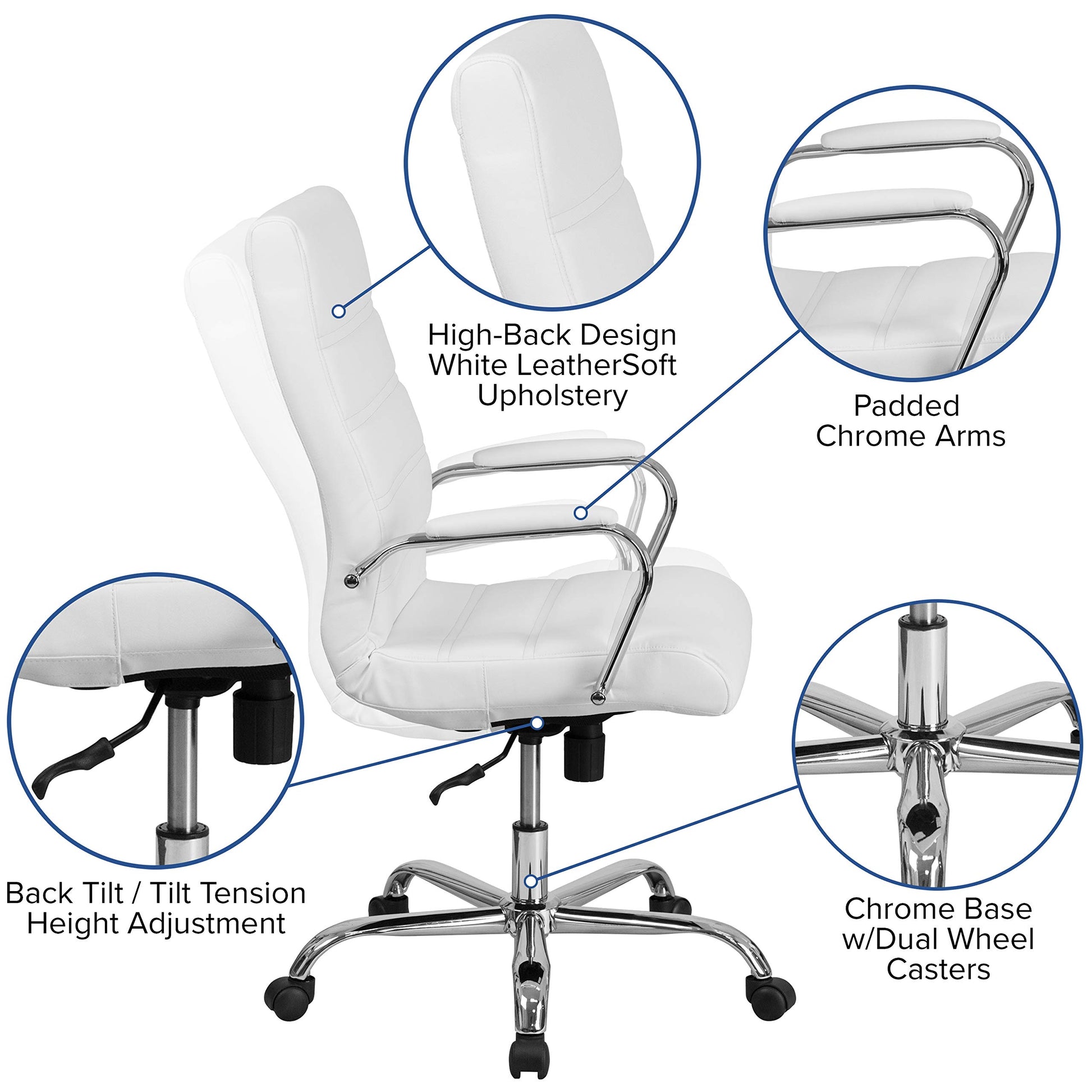 - UPGRADE YOUR WORKSPACE: Boasts a soft high-back white LeatherSoft back and seat paired with a chrome metal base and armrests all highlighted by an attractive horizontal line stitching to boost your desk or work area with modern style