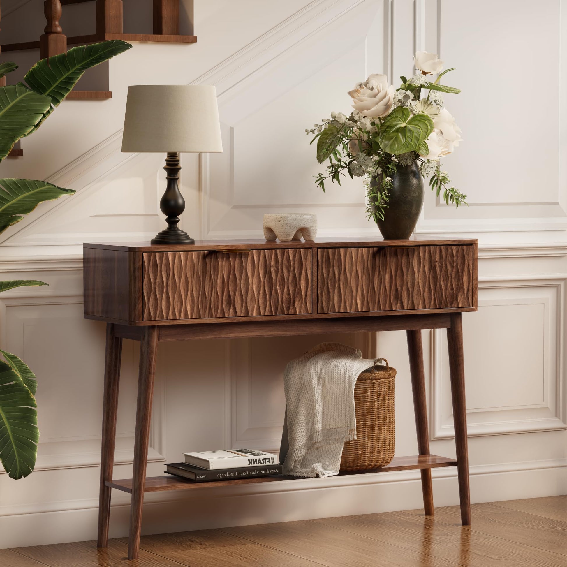 Elevate your entryway or living room with this sophisticated mid-century modern console table. Featuring elegant fluted drawer fronts and a rich walnut wood grain finish, this versatile piece combines timeless design with practical functionality.