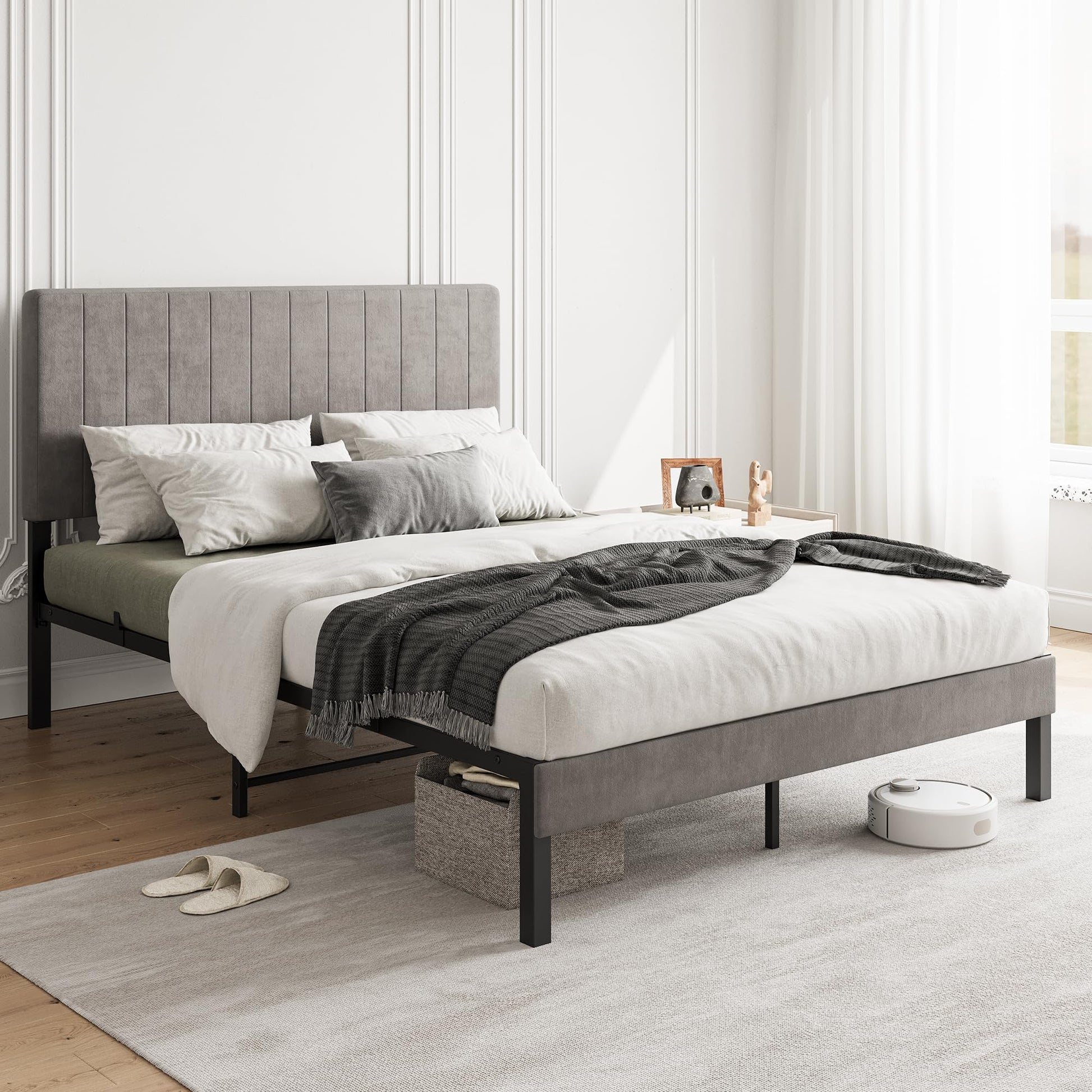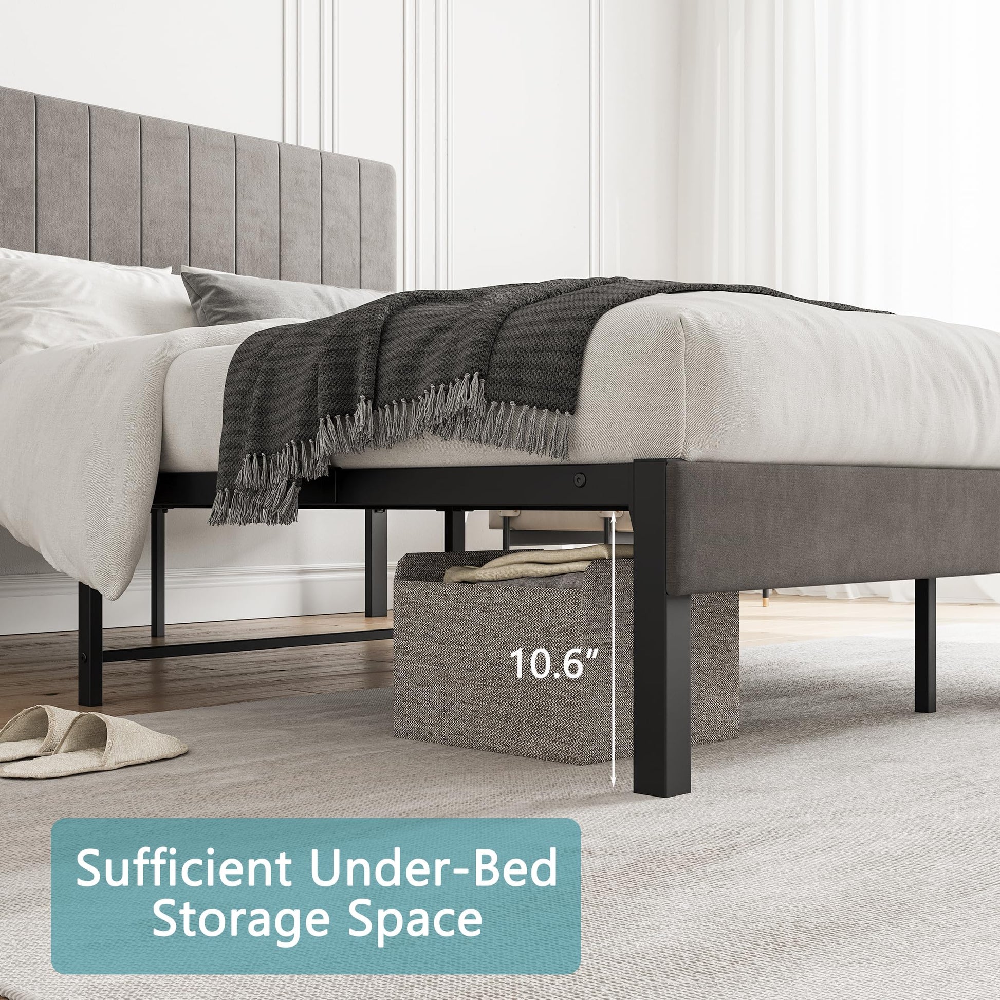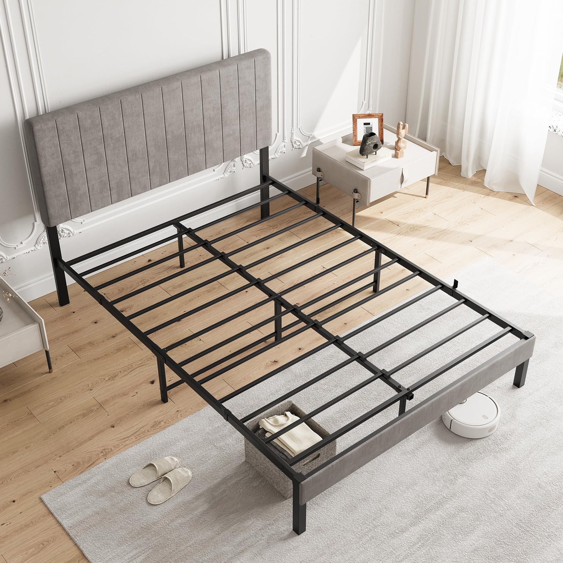 Full Size Upholstered Bed Frame with Tufted Headboard and Metal Slats Support, Heavy
