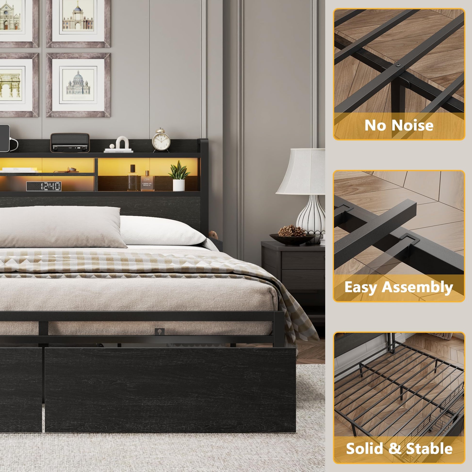Transform your bedroom with this modern full-size platform bed frame featuring integrated LED lighting, convenient charging station, and smart storage solutions. The sleek black oak finish and sturdy metal construction deliver both style and durability for years of restful sleep.
