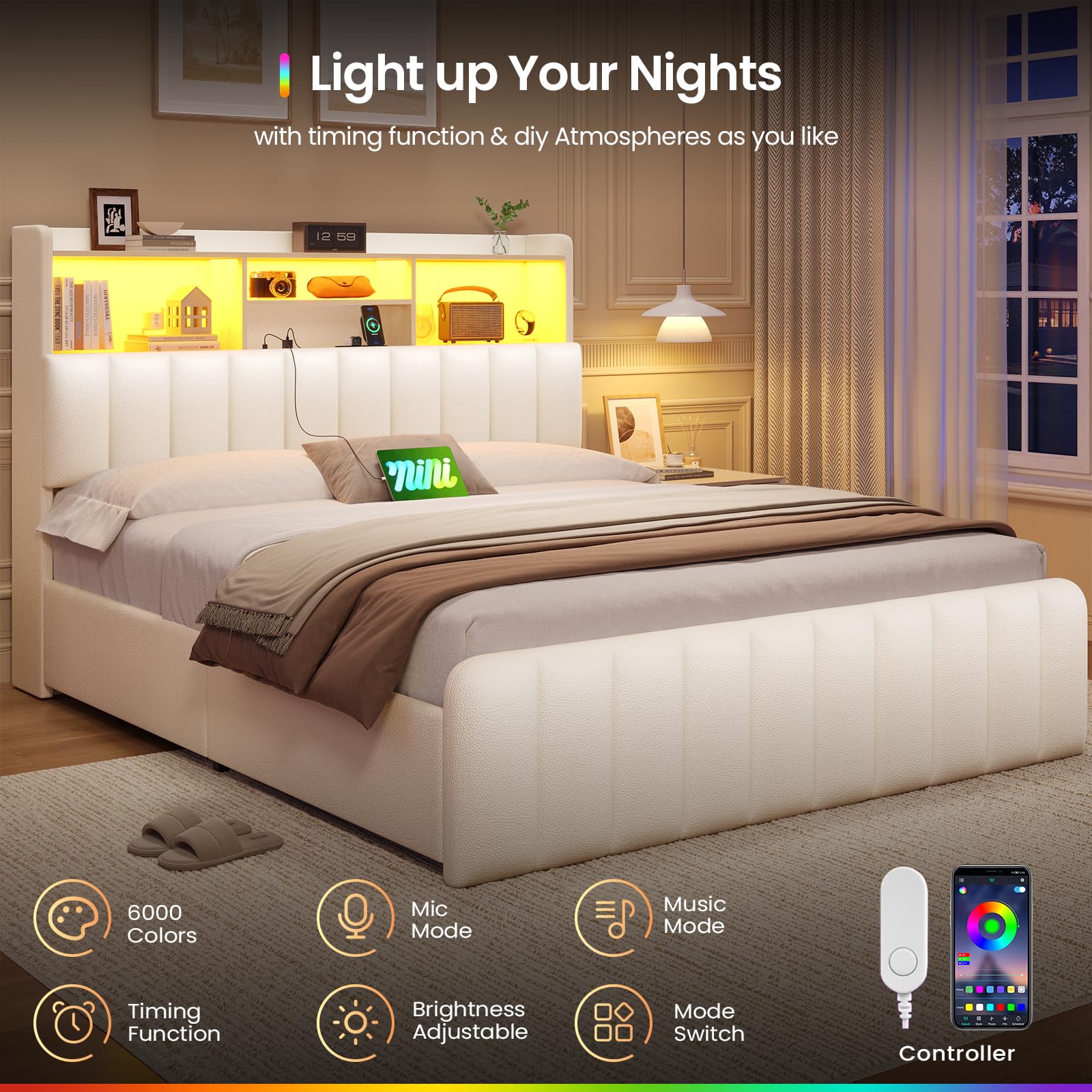 Transform your bedroom into a functional sanctuary with this sophisticated full-size bed frame. Featuring a bookcase headboard, four oversized storage drawers, built-in LED lighting, and a convenient charging station, this bed combines modern convenience with timeless design.
