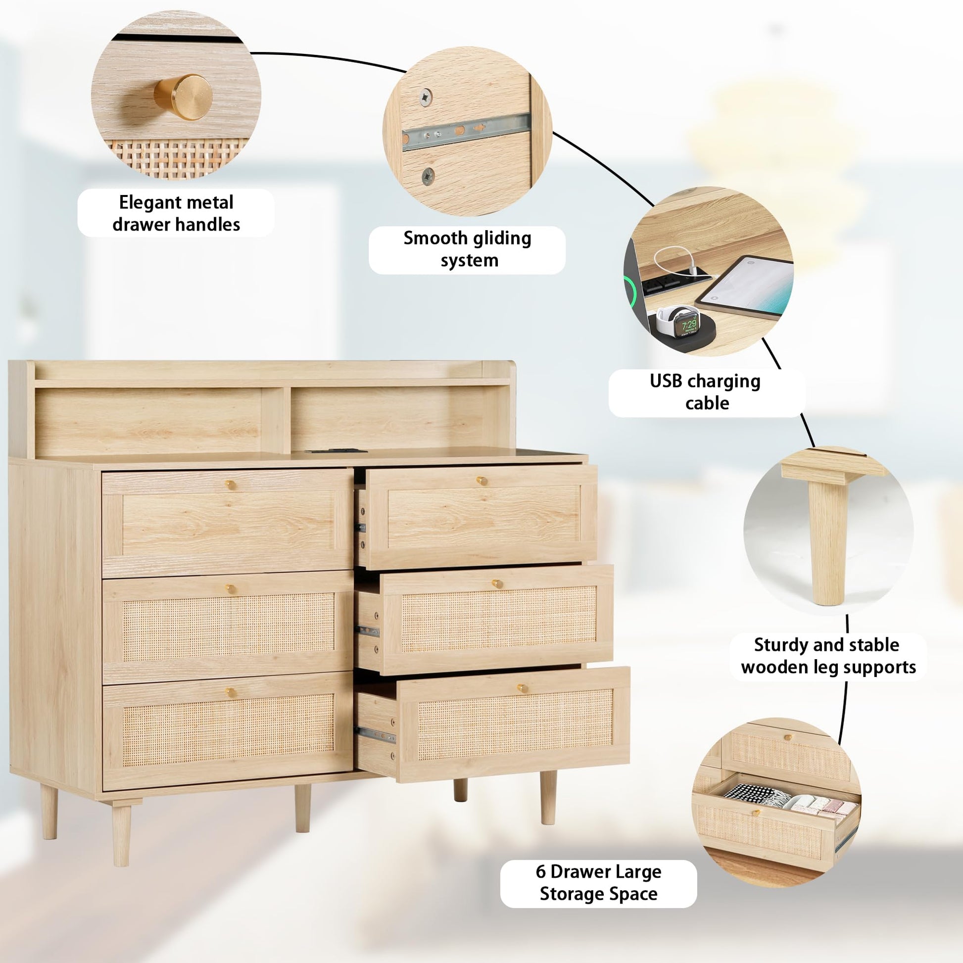 Rattan Dresser for Bedroom with Shelves, Modern 6 Drawer Double Dresser