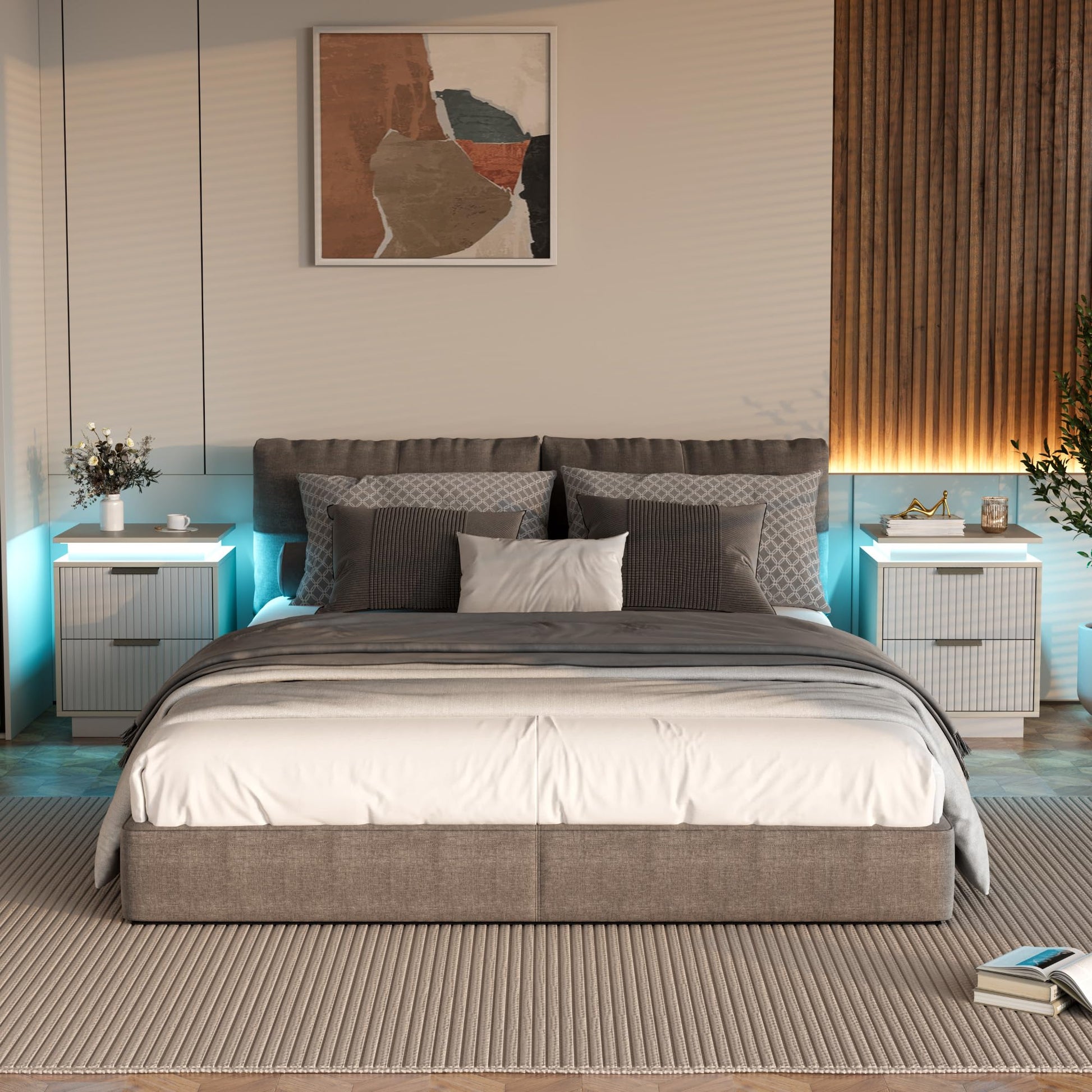 Nightstand with LED Light, Night Stand with Drawers, White Bedside Table