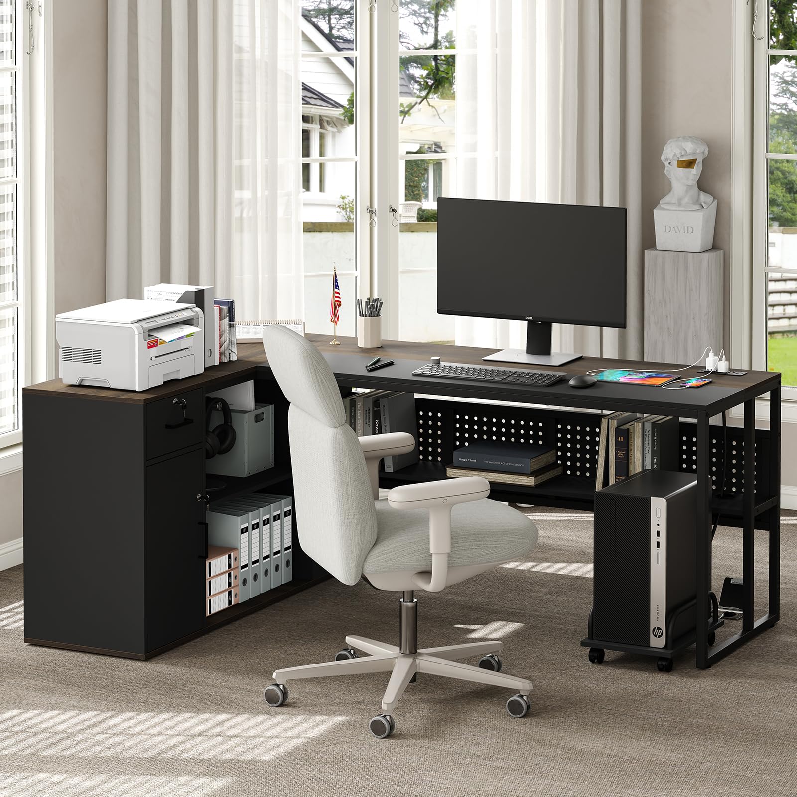 - This office desk coming with a storage cabinet, printer cabinet, CPU stand and storage shelves, the L shaped desk could hold printers, scanners, fax machines and any other office machines, keeps them within easy reach of your desk to maximize your work space. With powerful storage space, this L shaped computer desk can meet your different need of storage.