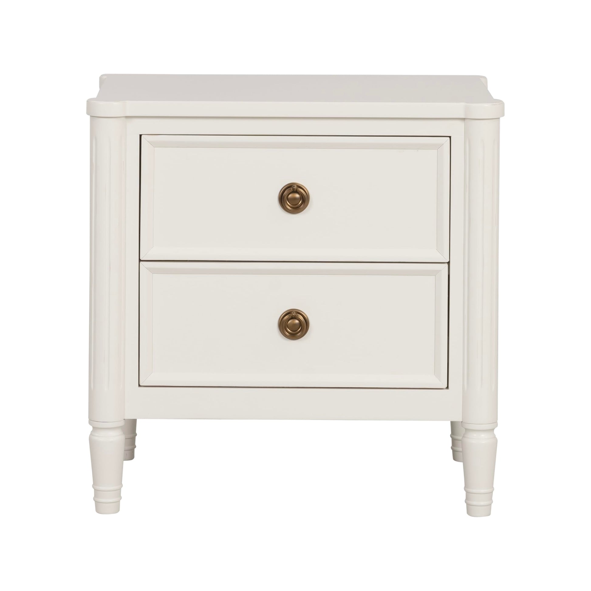 - Timeless elegance is reflected in the antique gold ring pulls and French arrow feet, enhancing the white nightstand’s luxurious appeal.