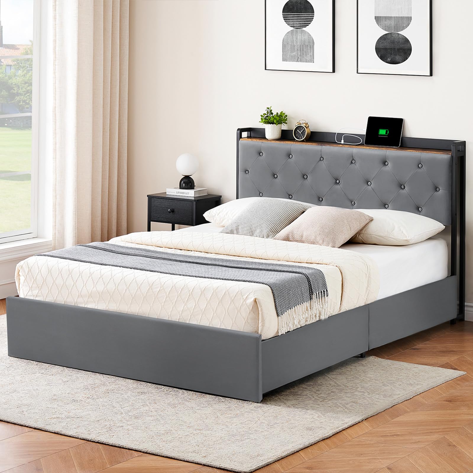 Queen Size Bed Frame with Headboard and 4 Storage Drawers Velvet Upholstered