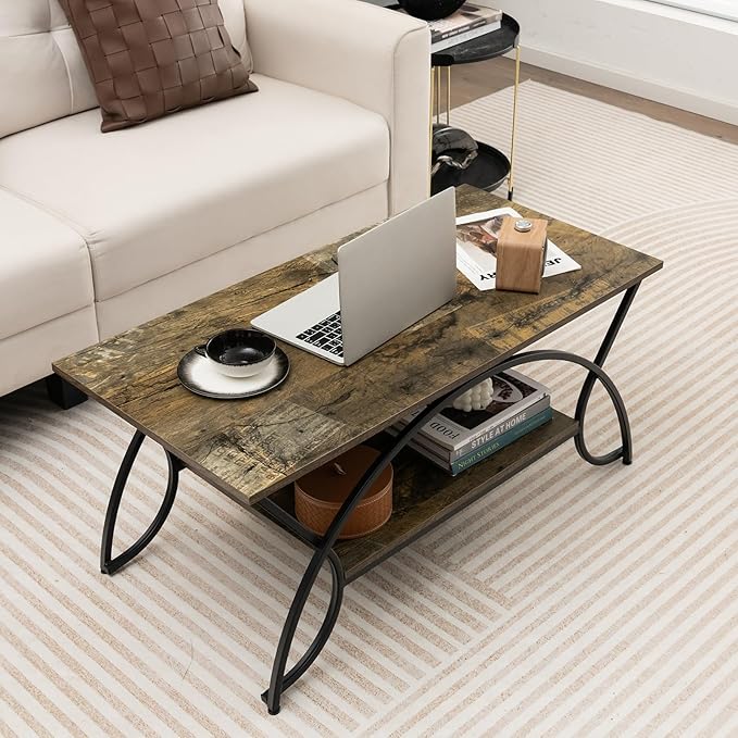 - This rectangular coffee table is equipped with a spacious tabletop and an open shelf at bottom, keeping your various items well organized and easy to access. It offers ample room to store or display a variety of items, like cups, fruit trays, snacks, family photos, remote control, books, decorations and more.