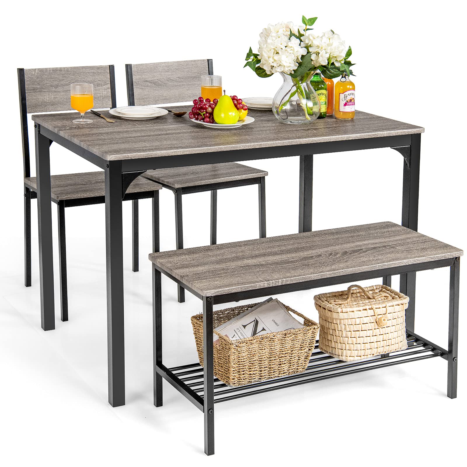 - Space-Saving Design Improves Utilization: Two armless chairs and the bench can be tucked under the table without taking up space. Also, the extra rack under the bench meets the needs for sitting & storing. All in all, this table set is suitable for limited living space.