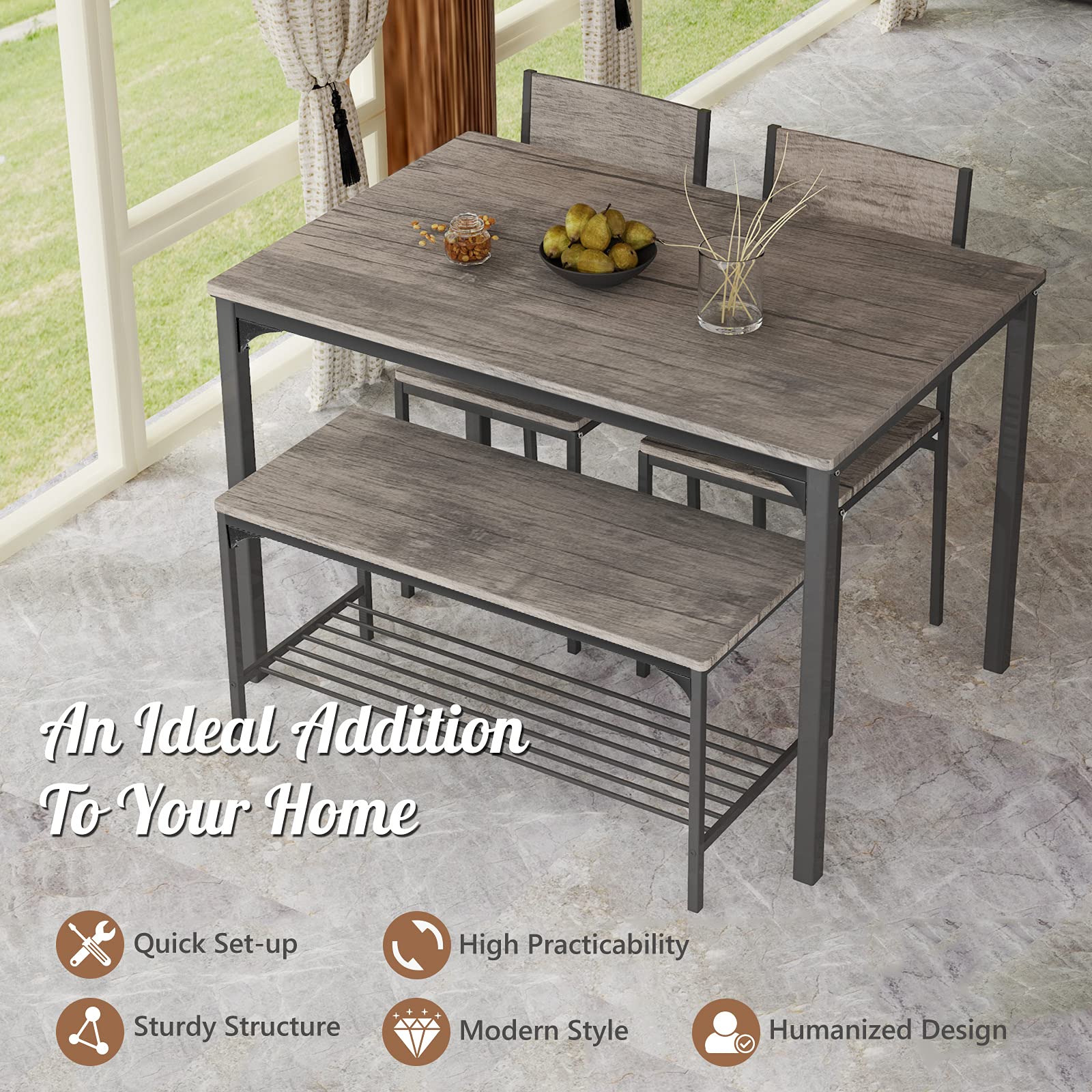 - Dining Table Set for 4: Includes a spacious table, 2 high-back chairs & 2-person bench, this modern dining table set allows 4 persons to have a small get-together for chatting & eating together. Ergonomic design and large sitting seats ensure a comfortable sitting experience.
